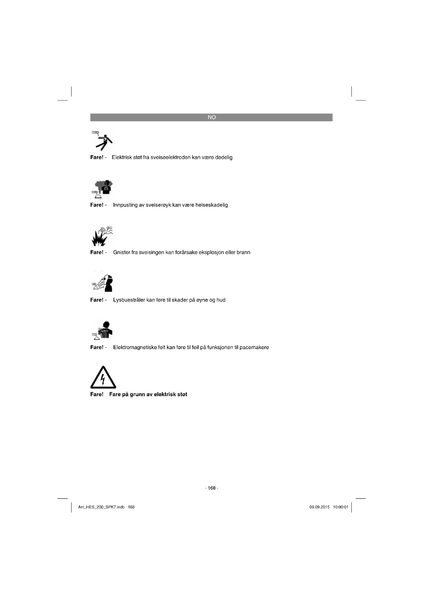 Fare! - Elektrisk støt fra sveiseelektroden kan være dødelig Fare! - Innpusting av sveiserøyk kan være helseskadelig Fare! - Lysbuestråler kan føre til skader på øyne og hud Fare! - Gnister fra sveisingen kan forårsake eksplosjon eller brann Fare! - Elektromagnetiske felt kan føre til feil på funksjonen til pacemakere Fare! Fare på grunn av elektrisk støt Anl_HES_200_SPK7.indb 168Anl_HES_200_SPK7.indb 168 09.09.2015 10:00:0109.09.2015 10:00:01NO