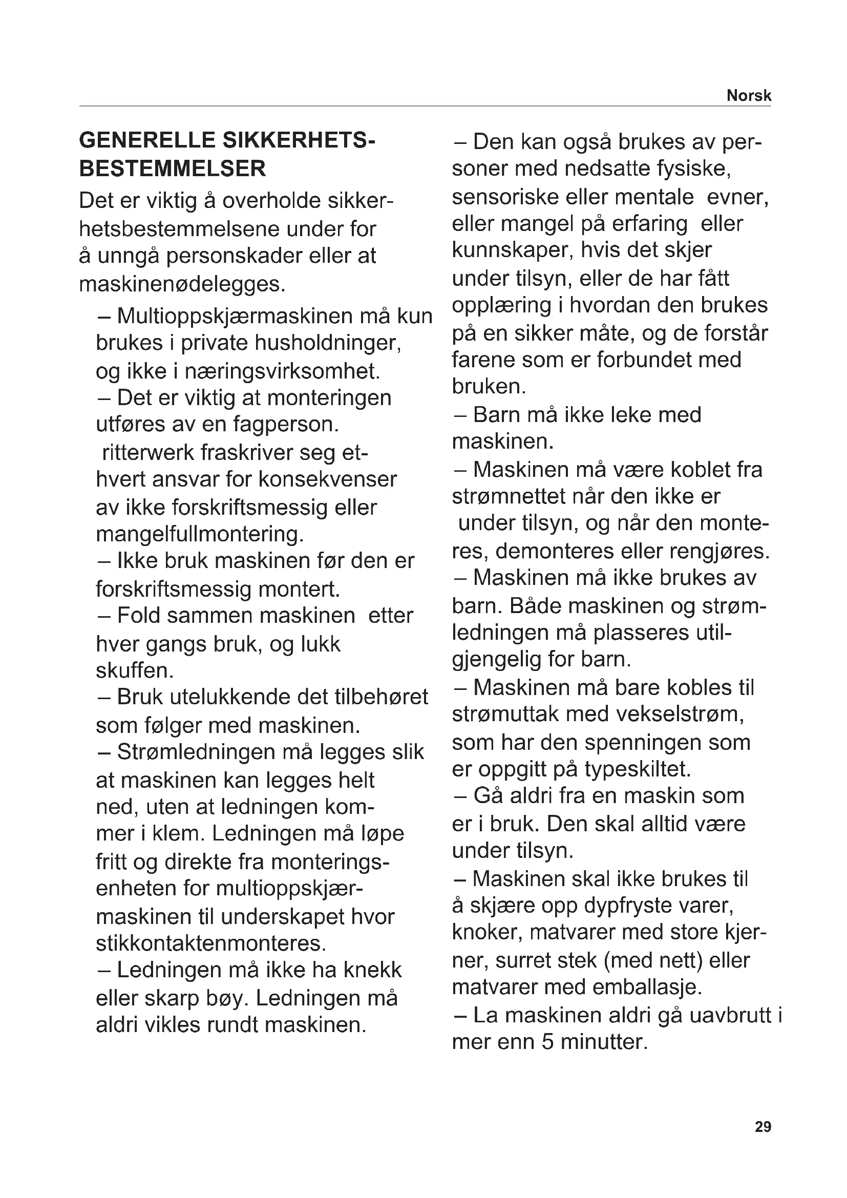 - Monter rundhjulet på nytt. VEDLIKEHOLD Multioppskjærmaskinen er vedlikeholdsfri. Vi anbefaler imidlertid å ettersmøre sporet på skyvebrettet med vaselin med jevne mellomrom, slik at det beholder bevegeligheten. OPPBEVARING Oppbevar maskinen utilgjenge- lig for barn. Ledningen skal alltid ligge i det integrerte ledningsrommet. KASSERING Dette produktet må ikke kasseres sammen med vanlig hushold- ningsavfall etter endt levetid. Det skal leveres inn til oppsamlingssted/kommunalt mottak for gjenvinning av elektriske og elektroniske appa- rater. Symbolet på produktet, bruksanvisningen eller emballa- sjen gir informasjon om dette. Materialene kan gjenvin- nes i henhold til merkingen. Med gjenvinning, gjenbruk av materialene eller andre former for nyttiggjøring av kasserte ap- parater, yter du et viktig bidrag for å verne miljøet. Innhent informasjon om avhen- ding hos de lokale myndigheter. DET EUROPEISKE KJEMIKALIEREGELVER- KET (REACh) Besøk oss på: www.ritterwerk.de EKSTRAUTSTYR En utannet rundkniv (skinke- blad) som egner seg spesielt for skjæring av kjøtt, pølse og skinke, kan leveres. SERVICE, REPARASJONER OG RESERVEDELER Kontakt din lokale forhandler/ kundeservice for service, repa- rasjoner og reservedeler! Besøk oss på: www.ritterwerk.de TEKNISKE DATA Denne maskinen er i samsvar med følgende direktiver