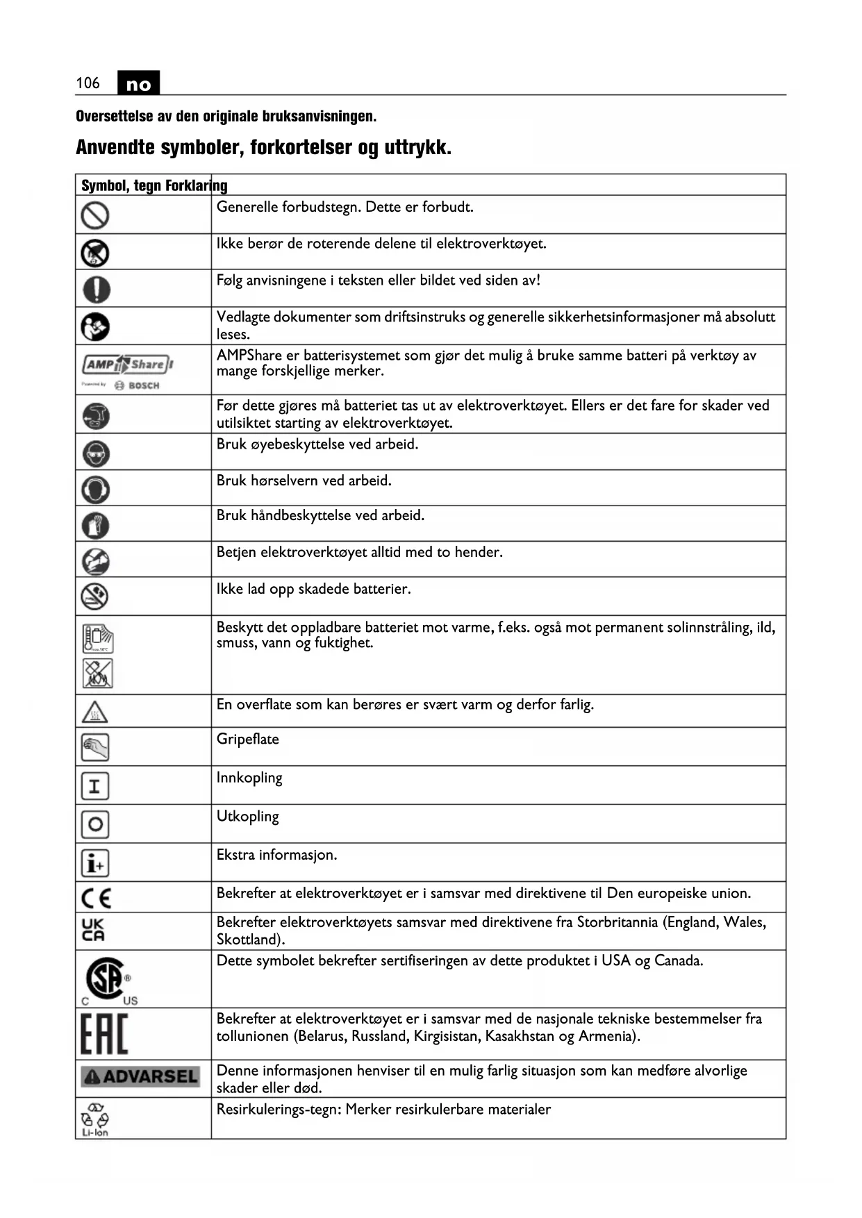 Oversettelse av den originale bruksanvisningen. Anvendte symboler, forkortelser og uttrykk. Symbol, tegn Forklaring Generelle forbudstegn. Dette er forbudt. Ikke berør de roterende delene til elektroverktøyet. Følg anvisningene i teksten eller bildet ved siden av! Vedlagte dokumenter som driftsinstruks og generelle sikkerhetsinformasjoner må absolutt leses. AMPShare er batterisystemet som gjør det mulig å bruke samme batteri på verktøy av mange forskjellige merker. Før dette gjøres må batteriet tas ut av elektroverktøyet. Ellers er det fare for skader ved utilsiktet starting av elektroverktøyet. Bruk øyebeskyttelse ved arbeid. Bruk hørselvern ved arbeid. Bruk håndbeskyttelse ved arbeid. Betjen elektroverktøyet alltid med to hender. Ikke lad opp skadede batterier. Beskytt det oppladbare batteriet mot varme, f.eks. også mot permanent solinnstråling, ild, smuss, vann og fuktighet. En overflate som kan berøres er svært varm og derfor farlig. Gripeflate Innkopling Utkopling Ekstra informasjon. Bekrefter at elektroverktøyet er i samsvar med direktivene til Den europeiske union. Bekrefter elektroverktøyets samsvar med direktivene fra Storbritannia (England, Wales, Skottland). Dette symbolet bekrefter sertifiseringen av dette produktet i USA og Canada. Bekrefter at elektroverktøyet er i samsvar med de nasjonale tekniske bestemmelser fra tollunionen (Belarus, Russland, Kirgisistan, Kasakhstan og Armenia). Denne informasjonen henviser til en mulig farlig situasjon som kan medføre alvorlige skader eller død. Resirkulerings-tegn: Merker resirkulerbare materialer max.50°C107