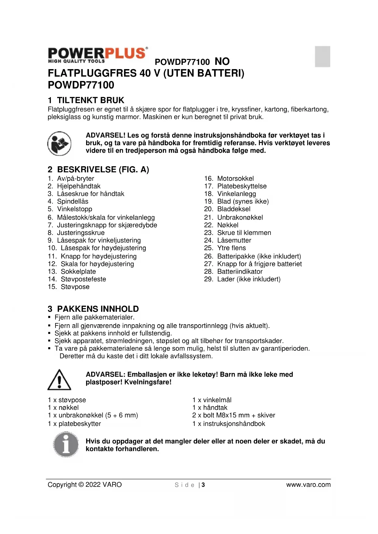 Copyright © 2022 VARO S i d e | 3 www.varo.com FLATPLUGGFRES 40 V (UTEN BATTERI) POWDP77100 1 TILTENKT BRUK Flatpluggfresen er egnet til å skjære spor for flatplugger i tre, kryssfiner, kartong, fiberkartong, pleksiglass og kunstig marmor. Maskinen er kun beregnet til privat bruk. ADVARSEL! Les og forstå denne instruksjonshåndboka før verktøyet tas i bruk, og ta vare på håndboka for fremtidig referanse. Hvis verktøyet leveres videre til en tredjeperson må også håndboka følge med. 2 BESKRIVELSE (FIG. A)