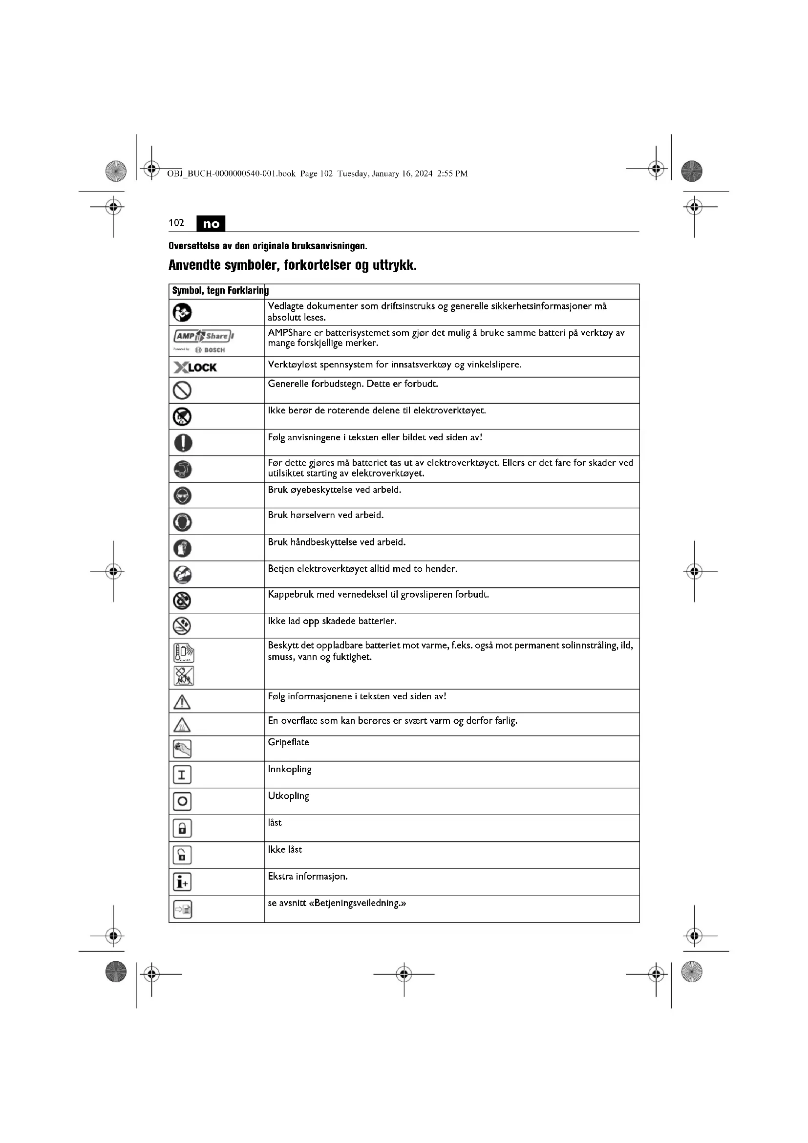 Oversettelse av den originale bruksanvisningen. Anvendte symboler, forkortelser og uttrykk. Symbol, tegn Forklaring Vedlagte dokumenter som driftsinstruks og generelle sikkerhetsinformasjoner må absolutt leses. AMPShare er batterisystemet som gjør det mulig å bruke samme batteri på verktøy av mange forskjellige merker. Verktøyløst spennsystem for innsatsverktøy og vinkelslipere. Generelle forbudstegn. Dette er forbudt. Ikke berør de roterende delene til elektroverktøyet. Følg anvisningene i teksten eller bildet ved siden av! Før dette gjøres må batteriet tas ut av elektroverktøyet. Ellers er det fare for skader ved utilsiktet starting av elektroverktøyet. Bruk øyebeskyttelse ved arbeid. Bruk hørselvern ved arbeid. Bruk håndbeskyttelse ved arbeid. Betjen elektroverktøyet alltid med to hender. Kappebruk med vernedeksel til grovsliperen forbudt. Ikke lad opp skadede batterier. Beskytt det oppladbare batteriet mot varme, f.eks. også mot permanent solinnstråling, ild, smuss, vann og fuktighet. Følg informasjonene i teksten ved siden av! En overflate som kan berøres er svært varm og derfor farlig. Gripeflate Innkopling Utkopling låst Ikke låst Ekstra informasjon. se avsnitt «Betjeningsveiledning.» max.50°C OBJ_BUCH-0000000540-001.book Page 102 Tuesday, January 16, 2024 2:55 PM103