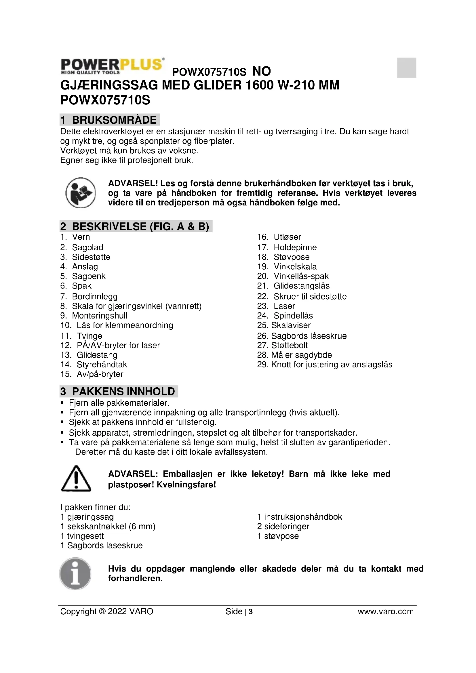 POWX075710S 1 BRUKSOMRÅDE Dette elektroverktøyet er en stasjonær maskin til rett- og tverrsaging i tre. Du kan sage hardt og mykt tre, og også sponplater og fiberplater. Verktøyet må kun brukes av voksne. Egner seg ikke til profesjonelt bruk. ADVARSEL! Les og forstå denne brukerhåndboken før verktøyet tas i bruk, og ta vare på håndboken for fremtidig referanse. Hvis verktøyet leveres videre til en tredjeperson må også håndboken følge med. 2 BESKRIVELSE (FIG. A & B)