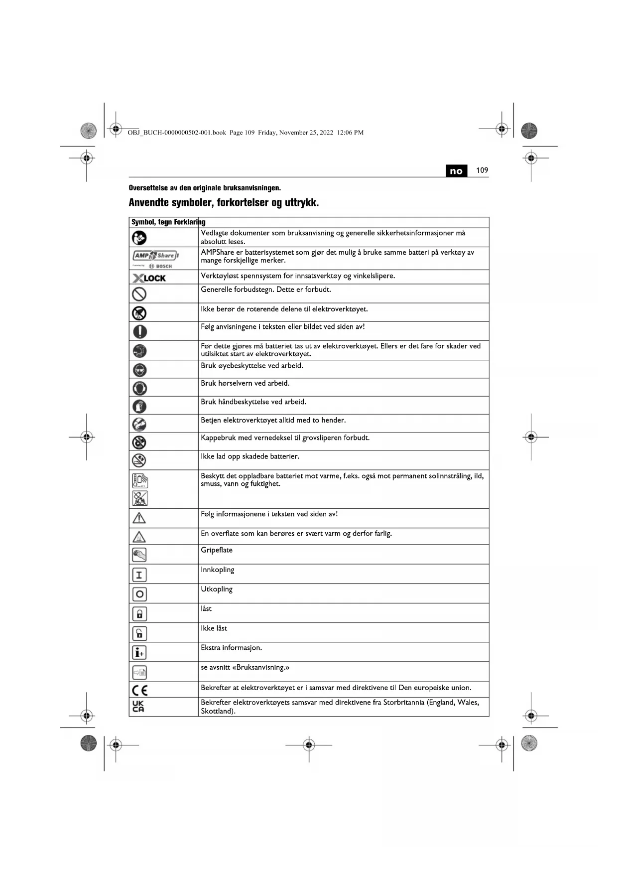 Oversettelse av den originale bruksanvisningen. Anvendte symboler, forkortelser og uttrykk. Symbol, tegn Forklaring Vedlagte dokumenter som bruksanvisning og generelle sikkerhetsinformasjoner må absolutt leses. AMPShare er batterisystemet som gjør det mulig å bruke samme batteri på verktøy av mange forskjellige merker. Verktøyløst spennsystem for innsatsverktøy og vinkelslipere. Generelle forbudstegn. Dette er forbudt. Ikke berør de roterende delene til elektroverktøyet. Følg anvisningene i teksten eller bildet ved siden av! Før dette gjøres må batteriet tas ut av elektroverktøyet. Ellers er det fare for skader ved utilsiktet start av elektroverktøyet. Bruk øyebeskyttelse ved arbeid. Bruk hørselvern ved arbeid. Bruk håndbeskyttelse ved arbeid. Betjen elektroverktøyet alltid med to hender. Kappebruk med vernedeksel til grovsliperen forbudt. Ikke lad opp skadede batterier. Beskytt det oppladbare batteriet mot varme, f.eks. også mot permanent solinnstråling, ild, smuss, vann og fuktighet. Følg informasjonene i teksten ved siden av! En overflate som kan berøres er svært varm og derfor farlig. Gripeflate Innkopling Utkopling låst Ikke låst Ekstra informasjon. se avsnitt «Bruksanvisning.» Bekrefter at elektroverktøyet er i samsvar med direktivene til Den europeiske union. Bekrefter elektroverktøyets samsvar med direktivene fra Storbritannia (England, Wales, Skottland). max.50°C OBJ_BUCH-0000000502-001.book Page 109 Friday, November 25, 2022 12:06 PM110