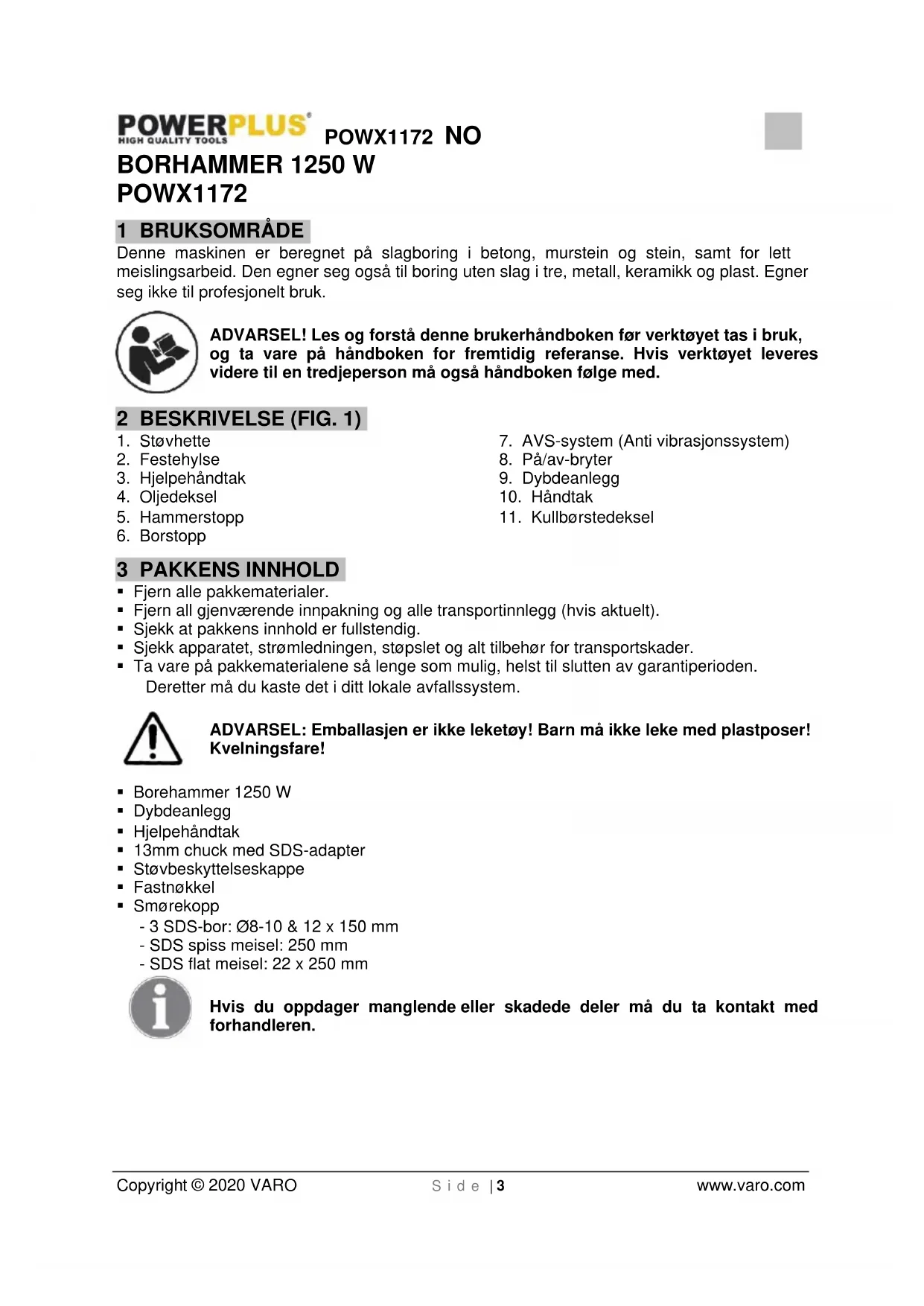 Ledningslengde 3 m + VDE-plugg Type chuck 13mm chuck med SDS-adapterPOWX1172 NO Copyright © 2020 VARO S i d e | 9 www.varo.com 12 STØY Støyemisjonsverdier målt i samsvar med relevant standard. (K=3) Lydtrykknivå LpA 92 dB(A) Lydeffektnivå LwA 103 dB(A) VIKTIG! Bruk hørselsvern når lydtrykket er over 85 dB(A). aw (Vibrasjon): 14,6 m/s² K = 1,5 m/s² 13 SERVICEAVDELING Skadede brytere må byttes ut av vårt serviceverksted. Hvis det oppstår skade på strømkabelen (eller støpslet), må denne byttes ut med en ny spesialkabel som fås kjøpt hos vår kundeservice. Strømkabelen må bare skiftes av vår kundeservice (se siste side) eller av en kvalifisert person (elektriker). 14 OPPBEVARING Gjør maskinen og tilbehøret grundig rent. Oppbevar maskinen utenfor barnas rekkevidde, i stabil og sikker stilling, på et kjølig og tørt sted. Unngå for høye eller lave temperaturer. Beskytt maskinen mot direkte sollys. Oppbevar den om mulig i mørke. Ikke oppbevar maskinen under plast, dette skaper fuktighet. 15 GARANTI Dette produktet garanteres for en periode på 36 måneder fra datoen produktet ble kjøpt av første bruker. Denne garantien dekker alle material- eller produksjonsfeil, med unntak av: batterier, ladere, defekte deler som følge av vanlig slitasje, f.eks. lagre, børster, kabler og plugger eller tilbehør som bor, borebits, sagblader osv. eller skader eller feil som skyldes feil bruk, uhell eller endringer. Garantien dekker heller ikke kostnader ved forsendelse. Skader og/eller defekter som skyldes ukorrekt bruk dekkes heller ikke av garantien. Vi fraskriver oss også alt ansvar for personskader som skyldes ukorrekt bruk av verktøyet. Reparasjoner må utføres ved et autorisert kundeservicesenter for Powerplus verktøy. Du kan alltid få flere opplysninger ved å ringe 00 32 3 292 92 90. Alle transportkostnader skal alltid betales av kunden, med mindre noe annet er skriftlig avtalt. Garantien dekker ikke skader som skyldes manglende vedlikehold eller overbelastning. Garantien dekker bestemt ikke skader som skyldes inntrenging av væsker, inntrenging av mye støv, overlagt skade (med hensikt eller ved grov uaktsomhet), feilaktig bruk (bruk til noe produktet ikke er beregnet på), ikke-kompetent bruk (for eksempel ved at anvisningene i håndboken ignoreres), feilaktig montering, lynnedslag eller feil nettspenning. Denne listen er ikke begrensende. Garantikrav som aksepteres vil aldri føre til en forlengelse av garantiperioden. Heller ikke vil en ny garantiperiode starte dersom produktet erstattes. Produkter eller deler som erstattes under garantien, tilfaller Varo NV. Vi forbeholder oss retten til å avvise ethvert krav der kjøpet ikke kan verifiseres, eller når det er åpenbart at produktet ikke har blitt korrekt vedlikeholdt (rene ventilasjonsåpninger, kullbørster skiftet regelmessig, osv). Du må ta vare på kvitteringen som bevis på datoen for kjøpet. Verktøyet må returneres til din forhandler (uten demontering) i en akseptabel, ren tilstand (i originalemballasjen), sammen med kvittering på kjøpet.POWX1172 NO Copyright © 2020 VARO S i d e | 10 www.varo.com 16 MILJØ Hvis maskinen må skiftes ut etter lang tids bruk, må den ikke kastes sammen med husholdningsavfallet. Kast den på en miljøvennlig måte. Avfall produsert av elektriske maskiner må ikke behandles som husholdningsavfall. Sørg for å gjenvinne der anlegg eksisterer. Be lokale myndigheter eller forhandler om råd om gjenvinning. 17 SAMSVARSERKLÆRING VARO N.V. – Joseph Van Instraat 9 – BE2500 Lier – Belgia, erklærer at, Produktbetegnelse: Borhammer Merke: POWERplus Modell: POWX1172 oppfyller de vesentlige kravene og andre relevante bestemmelser i gjeldende EU-direktiver, basert på bruken av europeiske, harmoniserte standarder. Enhver uautorisert endring av apparatet vil annullere denne erklæringen. EU-direktiver (inkludert eventuelle tillegg frem til signaturdato): 2011/65/EU 2006/42/EC 2014/30/EU Europeiske harmoniserte standarder (inkludert eventuelle tillegg frem til signaturdato): EN60745-1 : 2009 EN60745-2-6 : 2010 EN55014-1 : 2017 EN55014-2 : 2015 EN61000-3-2 : 2014 EN61000-3-11 : 2000 Oppbevarer av teknisk dokumentasjon: Philippe Vankerkhove, VARO – Vic. Van Rompuy N.V. Undertegnede handler på vegne av selskapets CEO, Philippe Vankerkhove Regulatoriske saker - Samsvarsleder Lier, 31/03/2020POWX1172 DA Copyright © 2020 VARO S i d e | 1 www.varo.com 1 ANVENDELSE ................................................................................... 3 2 BESKRIVELSE (FIG. 1) ..................................................................... 3