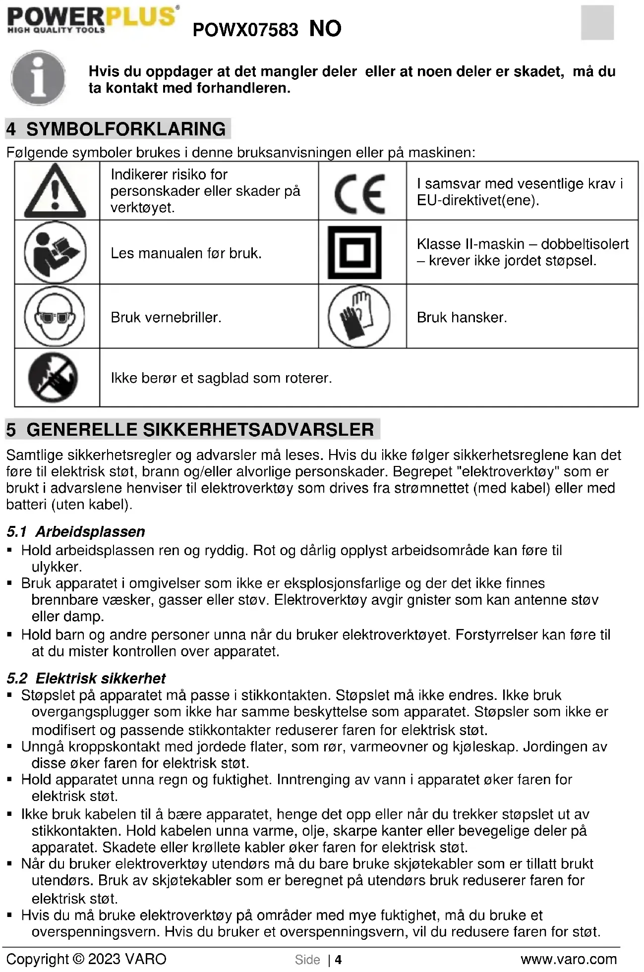 - Hvis du må bruke elektroverktøy på områder med mye fuktighet, må du bruke et overspenningsvern. Hvis du bruker et overspenningsvern, vil du redusere faren for støt.POWX07583 NO Copyright © 2023 VARO Side | 5 www.varo.com