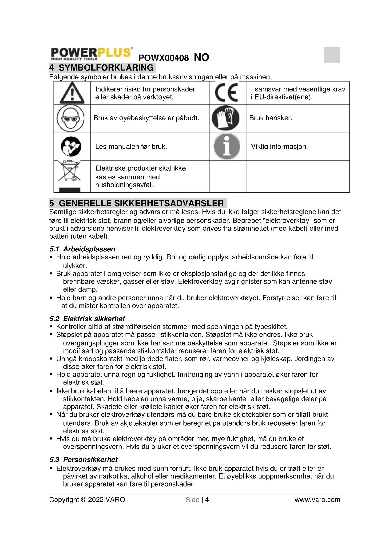 - Elektroverktøy må brukes med sunn fornuft. Ikke bruk apparatet hvis du er trøtt eller er påvirket av narkotika, alkohol eller medikamenter. Et øyeblikks uoppmerksomhet når du bruker apparatet kan føre til personskader.POWX00408 NO Copyright © 2022 VARO Side | 5 www.varo.com