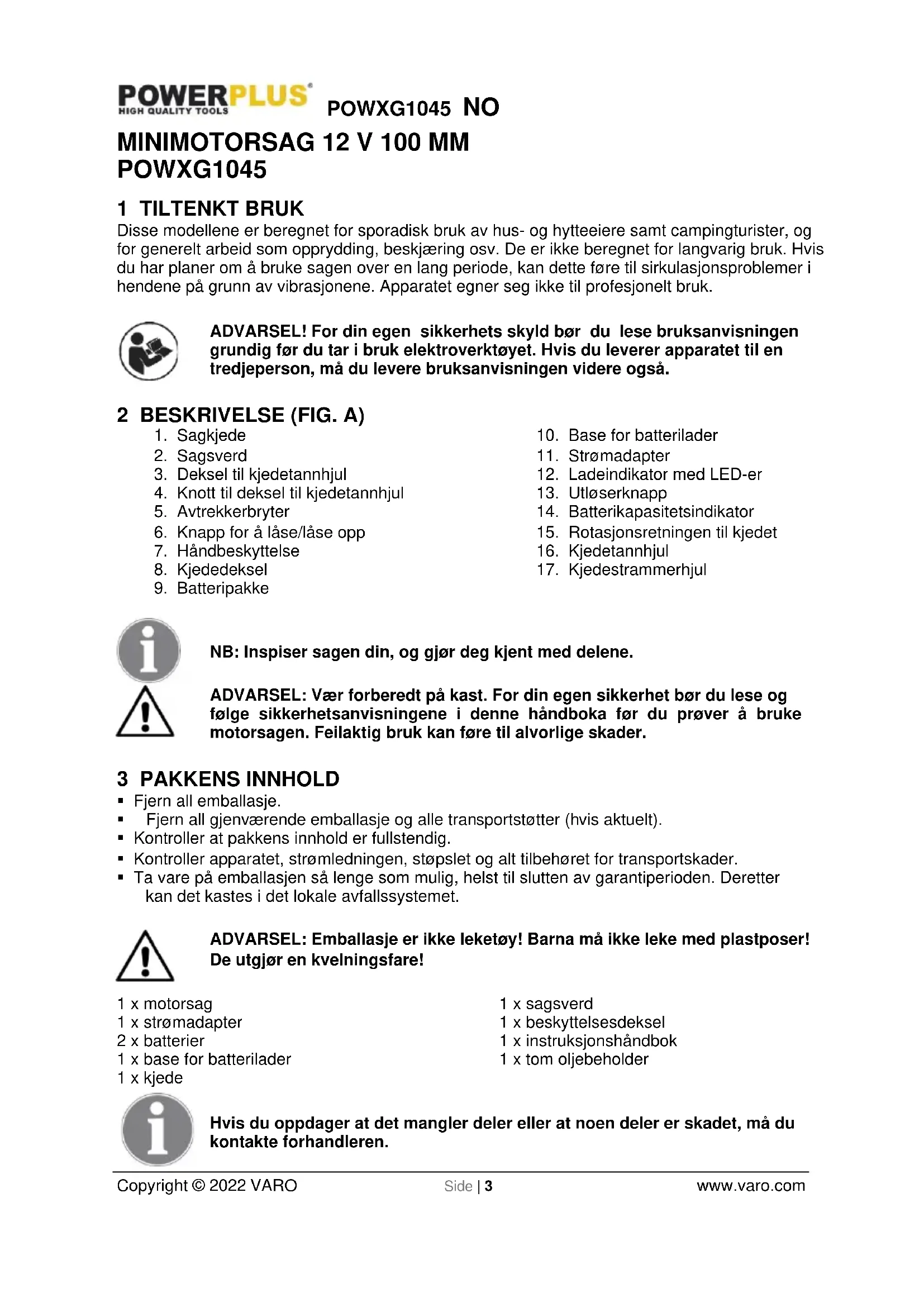 - Verktøyet må lades opp minst én gang per måned for å sikre best mulig funksjon. 17 MILJØ Hvis det skulle være nødvendig å skifte ut maskinen etter lang tids bruk, må den ikke kastes i husholdningsavfallet. Kast den på en miljømessig forsvarlig måte. Avfall produsert av elektriske maskiner bør ikke bli behandlet som normalt husholdningsavfall. Sørg for å resirkulere der hvor spesialanlegg eksisterer. Be lokale myndigheter eller forhandler om råd angående tømming og resirkulering.POWXG1045 NO Copyright © 2022 VARO Side | 13 www.varo.com 18 SAMSVARSERKLÆRING VARO – Vic Van Rompuy N.V. – Joseph Van Instraat 9 – BE2500 Lier – Belgia, erklærer på vegne av selskapet at, produkt: MINIMOTORSAG – BATTERIDREVET merke: PowerPlus modell: POWXG1045 oppfyller de vesentlige kravene og andre relevante bestemmelser i gjeldende EU-direktiver, basert på bruken av europeiske, harmoniserte standarder. Enhver uautorisert endring av apparatet vil annullere denne erklæringen. EU-direktiver (inkludert eventuelle tillegg frem til signaturdato): 2011/65/EU 2006/42/EC 2014/30/EU 2000/14/EC Vedlegg V LwA Målt 86 dB(A) Garantert 90 dB(A) Europeiske harmoniserte standarder (inkludert eventuelle tillegg frem til signaturdato): EN62841-1: 2015 EN55014-1: 2017 EN55014-2: 2015 Oppbevarer av teknisk dokumentasjon: Philippe Vankerkhove, VARO – Vic. Van Rompuy N.V. Undertegnede handler på vegne av selskapets CEO, Ludo Mertens Sertifiseringsansvarlig 01/12/2021, Lier – BelgiaPOWXG1045 DA Copyright © 2022 VARO S i d e | 1 www.varo.com 1 TILSIGTET BRUG ........................................................................... 3