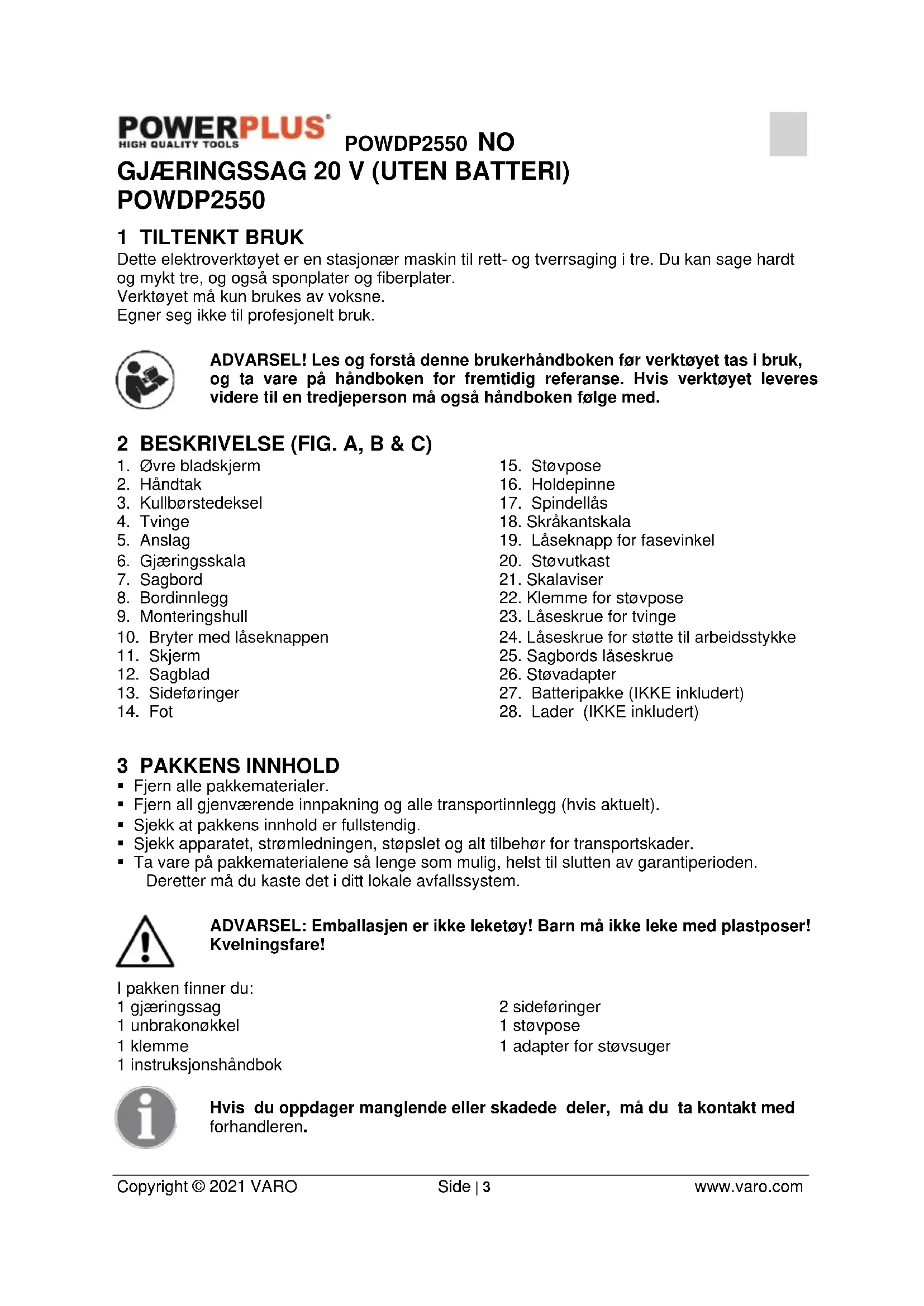 Copyright © 2021 VARO Side | 3 www.varo.com GJÆRINGSSAG 20 V (UTEN BATTERI) POWDP2550 1 TILTENKT BRUK Dette elektroverktøyet er en stasjonær maskin til rett- og tverrsaging i tre. Du kan sage hardt og mykt tre, og også sponplater og fiberplater. Verktøyet må kun brukes av voksne. Egner seg ikke til profesjonelt bruk. ADVARSEL! Les og forstå denne brukerhåndboken før verktøyet tas i bruk, og ta vare på håndboken for fremtidig referanse. Hvis verktøyet leveres videre til en tredjeperson må også håndboken følge med. 2 BESKRIVELSE (FIG. A, B & C)