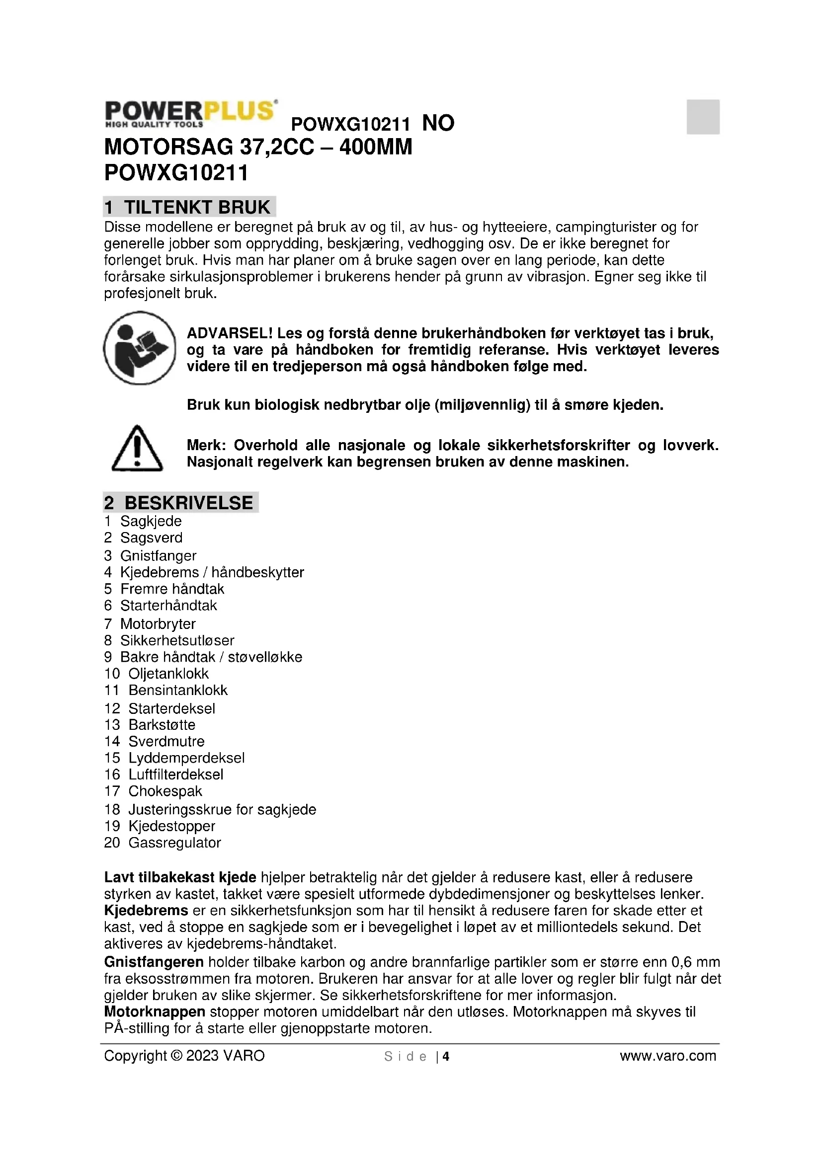 POWXG10211 1 TILTENKT BRUK Disse modellene er beregnet på bruk av og til, av hus- og hytteeiere, campingturister og for generelle jobber som opprydding, beskjæring, vedhogging osv. De er ikke beregnet for forlenget bruk. Hvis man har planer om å bruke sagen over en lang periode, kan dette forårsake sirkulasjonsproblemer i brukerens hender på grunn av vibrasjon. Egner seg ikke til profesjonelt bruk. ADVARSEL! Les og forstå denne brukerhåndboken før verktøyet tas i bruk, og ta vare på håndboken for fremtidig referanse. Hvis verktøyet leveres videre til en tredjeperson må også håndboken følge med. Bruk kun biologisk nedbrytbar olje (miljøvennlig) til å smøre kjeden. Merk: Overhold alle nasjonale og lokale sikkerhetsforskrifter og lovverk. Nasjonalt regelverk kan begrensen bruken av denne maskinen. 2 BESKRIVELSE 1 Sagkjede 2 Sagsverd 3 Gnistfanger 4 Kjedebrems / håndbeskytter 5 Fremre håndtak 6 Starterhåndtak 7 Motorbryter 8 Sikkerhetsutløser 9 Bakre håndtak / støvelløkke 10 Oljetanklokk 11 Bensintanklokk 12 Starterdeksel 13 Barkstøtte 14 Sverdmutre 15 Lyddemperdeksel 16 Luftfilterdeksel 17 Chokespak 18 Justeringsskrue for sagkjede 19 Kjedestopper 20 Gassregulator Lavt tilbakekast kjede hjelper betraktelig når det gjelder å redusere kast, eller å redusere styrken av kastet, takket være spesielt utformede dybdedimensjoner og beskyttelses lenker. Kjedebrems er en sikkerhetsfunksjon som har til hensikt å redusere faren for skade etter et kast, ved å stoppe en sagkjede som er i bevegelighet i løpet av et milliontedels sekund. Det aktiveres av kjedebrems-håndtaket. Gnistfangeren holder tilbake karbon og andre brannfarlige partikler som er større enn 0,6 mm fra eksosstrømmen fra motoren. Brukeren har ansvar for at alle lover og regler blir fulgt når det gjelder bruken av slike skjermer. Se sikkerhetsforskriftene for mer informasjon. Motorknappen stopper motoren umiddelbart når den utløses. Motorknappen må skyves til PÅ-stilling for å starte eller gjenoppstarte motoren.POWXG10211 NO Copyright © 2023 VARO S i d e | 5 www.varo.com Sikkerhetsutløser forebygger utilsiktet akselerasjon av motoren. Gassregulatorsperren kan ikke bli trykket inn med mindre sikkerhetsutløseren er trykket inn. Kjedebremshåndtak/ håndbeskytteren beskytter brukerens venstre hånd i tilfelle den glir av det fremre håndtaket mens sagen er i gang. Kjede fanger reduserer faren for skader i tilfelle sagens kjede går i stykker eller går av sporet mens den er i gang. Kjedefangeren er utformet med henblikk på å fange et slående kjede. Nb: studere sagen din og gjør deg kjent med delene. ADVARSEL! Vær forberedt på kast. Hold godt på motorsagen med begge hender under bruk. For din egen sikkerhet, bør du lese og følge sikkerhetsanvisningene i denne bruksanvisningen før du prøver å bruke motorsagen. Uansvarlig bruk kan føre til alvorlige skader. ADVARSEL! Når du bruker gassredskaper, bør du følge grunnleggende sikkerhetsforskrifter, i tillegg til følgende regler, for å redusere faren for alvorlige personskader eller ødeleggelse av redskapet. 3 PAKKENS INNHOLD