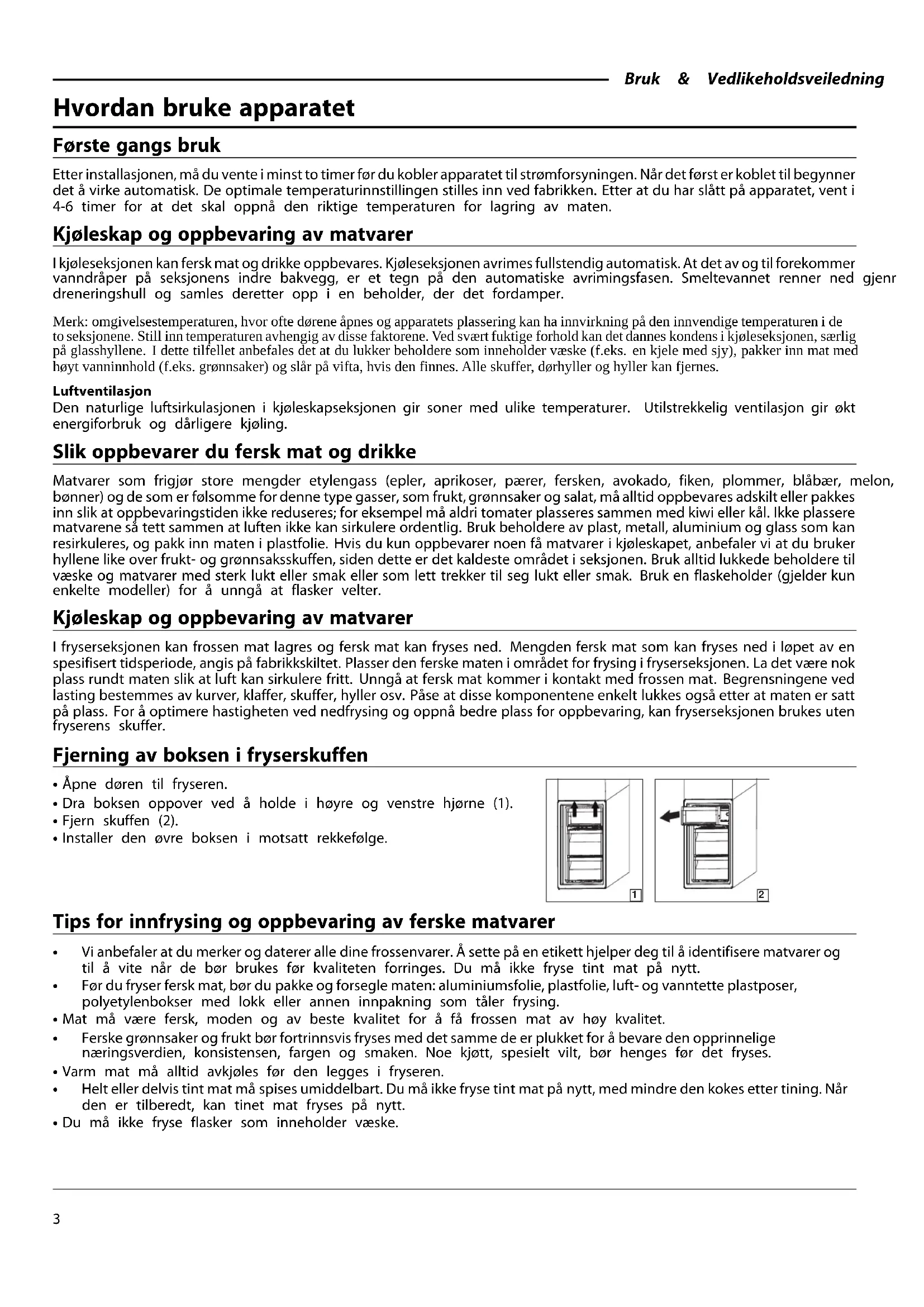 Hvordan bruke apparatet Første gangs bruk Etter installasjonen, må du vente i minst to timer før du kobler apparatet til strømforsyningen. Når det først er koblet til begynner det å virke automatisk. De optimale temperaturinnstillingen stilles inn ved fabrikken. Etter at du har slått på apparatet, vent i 4-6 timer for at det skal oppnå den riktige temperaturen for lagring av maten. Kjøleskap og oppbevaring av matvarer I kjøleseksjonen kan fersk mat og drikke oppbevares. Kjøleseksjonen avrimes fullstendig automatisk. At det av og til forekommer vanndråper på seksjonens indre bakvegg, er et tegn på den automatiske avrimingsfasen. Smeltevannet renner ned gjennom et dreneringshull og samles deretter opp i en beholder, der det fordamper. Merk: omgivelsestemperaturen, hvor ofte dørene åpnes og apparatets plassering kan ha innvirkning på den innvendige temperaturen i de to seksjonene. Still inn temperaturen avhengig av disse faktorene. Ved svært fuktige forhold kan det dannes kondens i kjøleseksjonen, særlig på glasshyllene. I dette tilfellet anbefales det at du lukker beholdere som inneholder væske (f.eks. en kjele med sjy), pakker inn mat med høyt vanninnhold (f.eks. grønnsaker) og slår på vifta, hvis den finnes. Alle skuffer, dørhyller og hyller kan fjernes. Luftventilasjon Den naturlige luftsirkulasjonen i kjøleskapseksjonen gir soner med ulike temperaturer. Utilstrekkelig ventilasjon gir økt energiforbruk og dårligere kjøling. Slik oppbevarer du fersk mat og drikke Matvarer som frigjør store mengder etylengass (epler, aprikoser, pærer, fersken, avokado, fiken, plommer, blåbær, melon, bønner) og de som er følsomme for denne type gasser, som frukt, grønnsaker og salat, må alltid oppbevares adskilt eller pakkes inn slik at oppbevaringstiden ikke reduseres; for eksempel må aldri tomater plasseres sammen med kiwi eller kål. Ikke plassere matvarene så tett sammen at luften ikke kan sirkulere ordentlig. Bruk beholdere av plast, metall, aluminium og glass som kan resirkuleres, og pakk inn maten i plastfolie. Hvis du kun oppbevarer noen få matvarer i kjøleskapet, anbefaler vi at du bruker hyllene like over frukt- og grønnsaksskuffen, siden dette er det kaldeste området i seksjonen. Bruk alltid lukkede beholdere til væske og matvarer med sterk lukt eller smak eller som lett trekker til seg lukt eller smak. Bruk en flaskeholder (gjelder kun enkelte modeller) for å unngå at flasker velter. Kjøleskap og oppbevaring av matvarer I fryserseksjonen kan frossen mat lagres og fersk mat kan fryses ned. Mengden fersk mat som kan fryses ned i løpet av en spesifisert tidsperiode, angis på fabrikkskiltet. Plasser den ferske maten i området for frysing i fryserseksjonen. La det være nok plass rundt maten slik at luft kan sirkulere fritt. Unngå at fersk mat kommer i kontakt med frossen mat. Begrensningene ved lasting bestemmes av kurver, klaffer, skuffer, hyller osv. Påse at disse komponentene enkelt lukkes også etter at maten er satt på plass. For å optimere hastigheten ved nedfrysing og oppnå bedre plass for oppbevaring, kan fryserseksjonen brukes uten fryserens skuffer. Fjerning av boksen i fryserskuffen