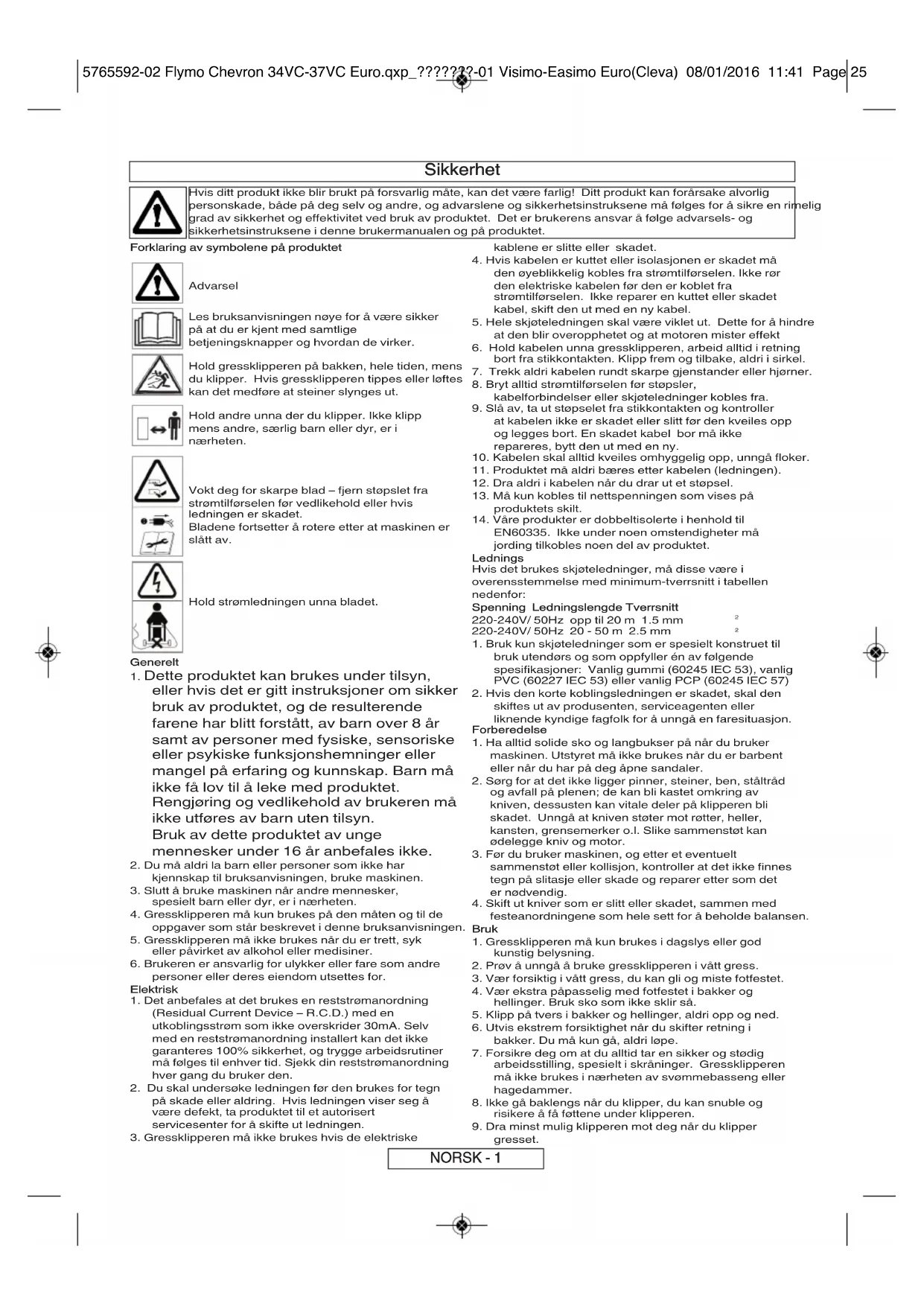 5765592-02 Flymo Chevron 34VC-37VC Euro.qxp_???????-01 Visimo-Easimo Euro(Cleva) 08/01/2016 11:41 Page 24Sikkerhet Hvis ditt produkt ikke blir brukt på forsvarlig måte, kan det være farlig! Ditt produkt kan forårsake alvorlig personskade, både på deg selv og andre, og advarslene og sikkerhetsinstruksene må følges for å sikre en rimelig grad av sikkerhet og effektivitet ved bruk av produktet. Det er brukerens ansvar å følge advarsels- og sikkerhetsinstruksene i denne brukermanualen og på produktet. Forklaring av symbolene på produktet Advarsel Les bruksanvisningen nøye for å være sikker på at du er kjent med samtlige betjeningsknapper og hvordan de virker. Hold gressklipperen på bakken, hele tiden, mens du klipper. Hvis gressklipperen tippes eller løftes kan det medføre at steiner slynges ut. Hold andre unna der du klipper. Ikke klipp mens andre, særlig barn eller dyr, er i nærheten. Vokt deg for skarpe blad – fjern støpslet fra strømtilførselen før vedlikehold eller hvis ledningen er skadet. Bladene fortsetter å rotere etter at maskinen er slått av. Hold strømledningen unna bladet. Generelt
