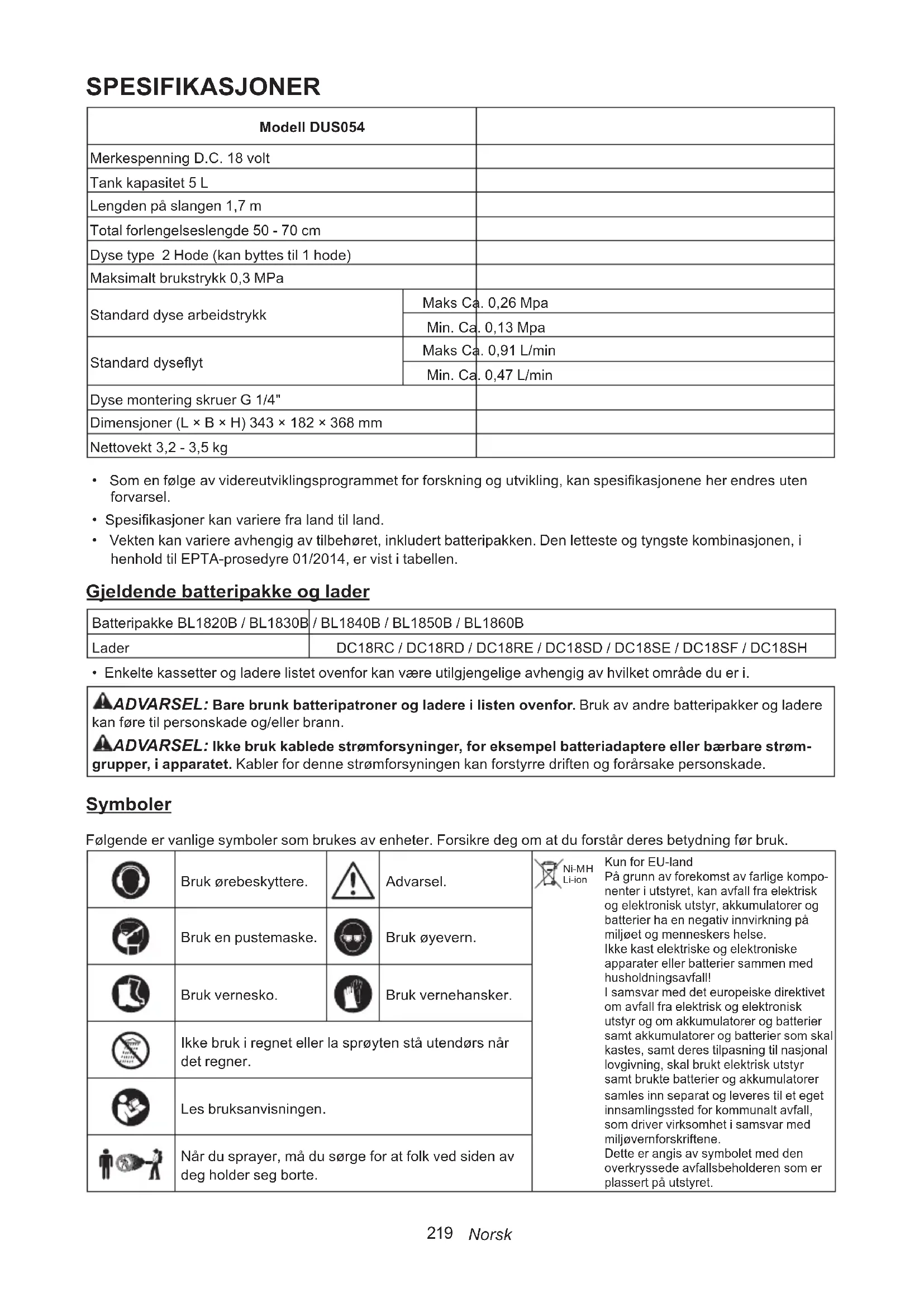 Li-ion Kun for EU-land På grunn av forekomst av farlige kompo- nenter i utstyret, kan avfall fra elektrisk og elektronisk utstyr, akkumulatorer og batterier ha en negativ innvirkning på miljøet og menneskers helse. Ikke kast elektriske og elektroniske apparater eller batterier sammen med husholdningsavfall! I samsvar med det europeiske direktivet om avfall fra elektrisk og elektronisk utstyr og om akkumulatorer og batterier samt akkumulatorer og batterier som skal kastes, samt deres tilpasning til nasjonal lovgivning, skal brukt elektrisk utstyr samt brukte batterier og akkumulatorer samles inn separat og leveres til et eget innsamlingssted for kommunalt avfall, som driver virksomhet i samsvar med miljøvernforskriftene. Dette er angis av symbolet med den overkryssede avfallsbeholderen som er plassert på utstyret. Bruk en pustemaske. Bruk øyevern. Bruk vernesko. Bruk vernehansker. Ikke bruk i regnet eller la sprøyten stå utendørs når det regner. Les bruksanvisningen. Når du sprayer, må du sørge for at folk ved siden av deg holder seg borte.220 Norsk TILTENKT BRUK Denne maskinen brukes til sprøyting. Støy. Typiske A-vektede støynivåer bestemmes av EN62841-1:Lydtrykknivå (L ): 70 dB (A) eller mindreUsikkerhet (K): 3 dB (A) MERK: De erklærte støyutslippsverdiene er målt i henhold til standard testmetoder og kan brukes til å sammenligne ett verktøy med et annet.MERK: Publiserte støyutslippsverdier kan også bru-kes til foreløpig vurdering av eksponering.ADVARSEL: Bruk ørebeskyttere.ADVARSEL: Støyutslipp ved faktisk bruk av elektroverktøyet kan være forskjellig fra den opp-gitte verdien, avhengig av hvordan verktøyet bru-kes, spesielt typen arbeidsstykke som behandles. ADVARSEL: Det er viktig å bestemme sik- kerhetstiltakene som beskytter operatøren, som er basert på et estimat av eksponering under faktiske bruksforhold (i tillegg til utløsertiden bør alle deler av driftssyklusen, for eksempel tidspunktet for verktøyavstengning og idlyading, også vurderes). Vibrasjon. Den totale vibrasjonsverdien (triaksial vektorsum) bestemt i henhold EN62841-1: Arbeidsmodus: drift uten belastning Genererte vibrasjoner (a ) : 2,5 m/s eller mindre Usikkerhet (K): 1,5 m/s