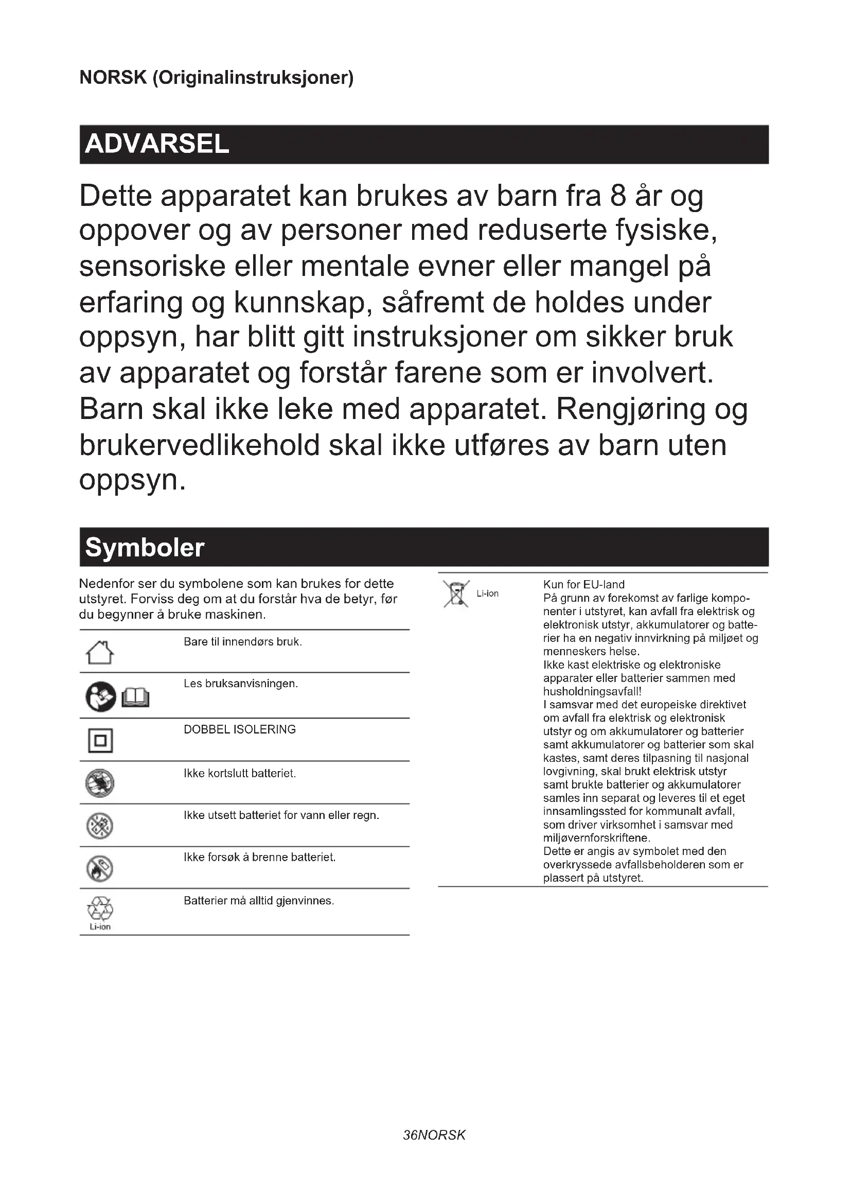 lese alle anvisninger og skilt på (1) batterilade- ren, (2) batteriet og (3) det produktet batteriet skal brukes i.