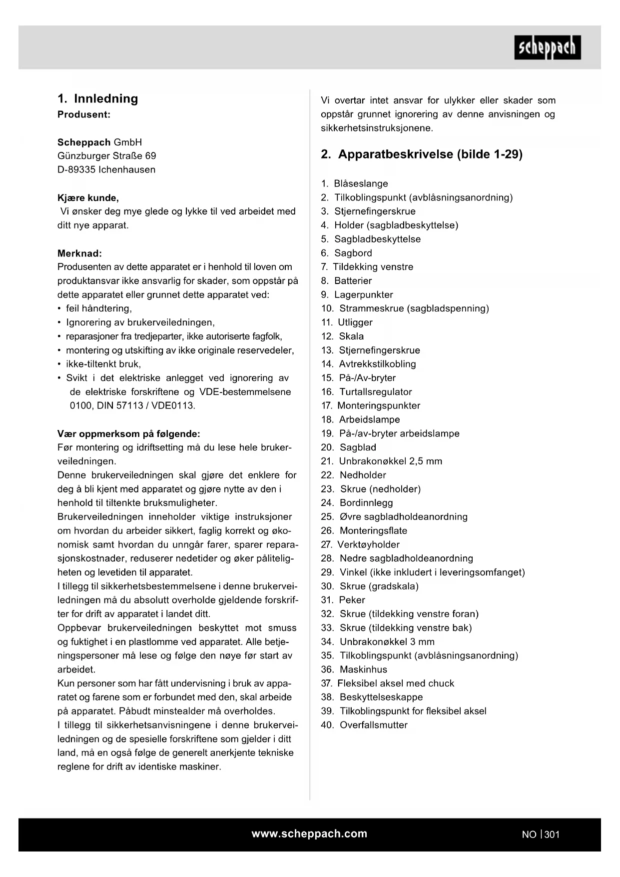 - Svikt i det elektriske anlegget ved ignorering av de elektriske forskriftene og VDE-bestemmelsene 0100, DIN 57113 / VDE0113. Vær oppmerksom på følgende: Før montering og idriftsetting må du lese hele bruker- veiledningen. Denne brukerveiledningen skal gjøre det enklere for deg å bli kjent med apparatet og gjøre nytte av den i henhold til tiltenkte bruksmuligheter. Brukerveiledningen inneholder viktige instruksjoner om hvordan du arbeider sikkert, faglig korrekt og øko- nomisk samt hvordan du unngår farer, sparer repara- sjonskostnader, reduserer nedetider og øker pålitelig- heten og levetiden til apparatet. I tillegg til sikkerhetsbestemmelsene i denne brukervei- ledningen må du absolutt overholde gjeldende forskrif- ter for drift av apparatet i landet ditt. Oppbevar brukerveiledningen beskyttet mot smuss og fuktighet i en plastlomme ved apparatet. Alle betje- ningspersoner må lese og følge den nøye før start av arbeidet. Kun personer som har fått undervisning i bruk av appa- ratet og farene som er forbundet med den, skal arbeide på apparatet. Påbudt minstealder må overholdes. I tillegg til sikkerhetsanvisningene i denne brukervei- ledningen og de spesielle forskriftene som gjelder i ditt land, må en også følge de generelt anerkjente tekniske reglene for drift av identiske maskiner.www.scheppach.com