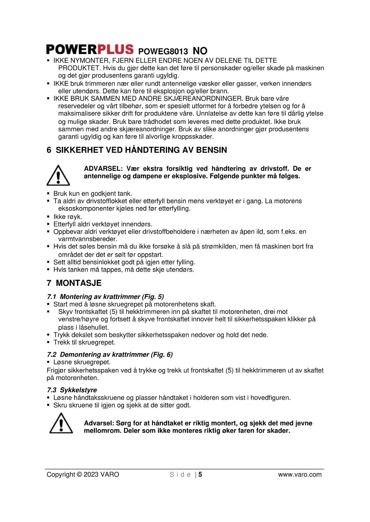 - Skru skruene til igjen og sjekk at de sitter godt. Advarsel: Sørg for at håndtaket er riktig montert, og sjekk det med jevne mellomrom. Deler som ikke monteres riktig øker faren for skader.POWEG8013 NO Copyright © 2023 VARO S i d e | 6 www.varo.com