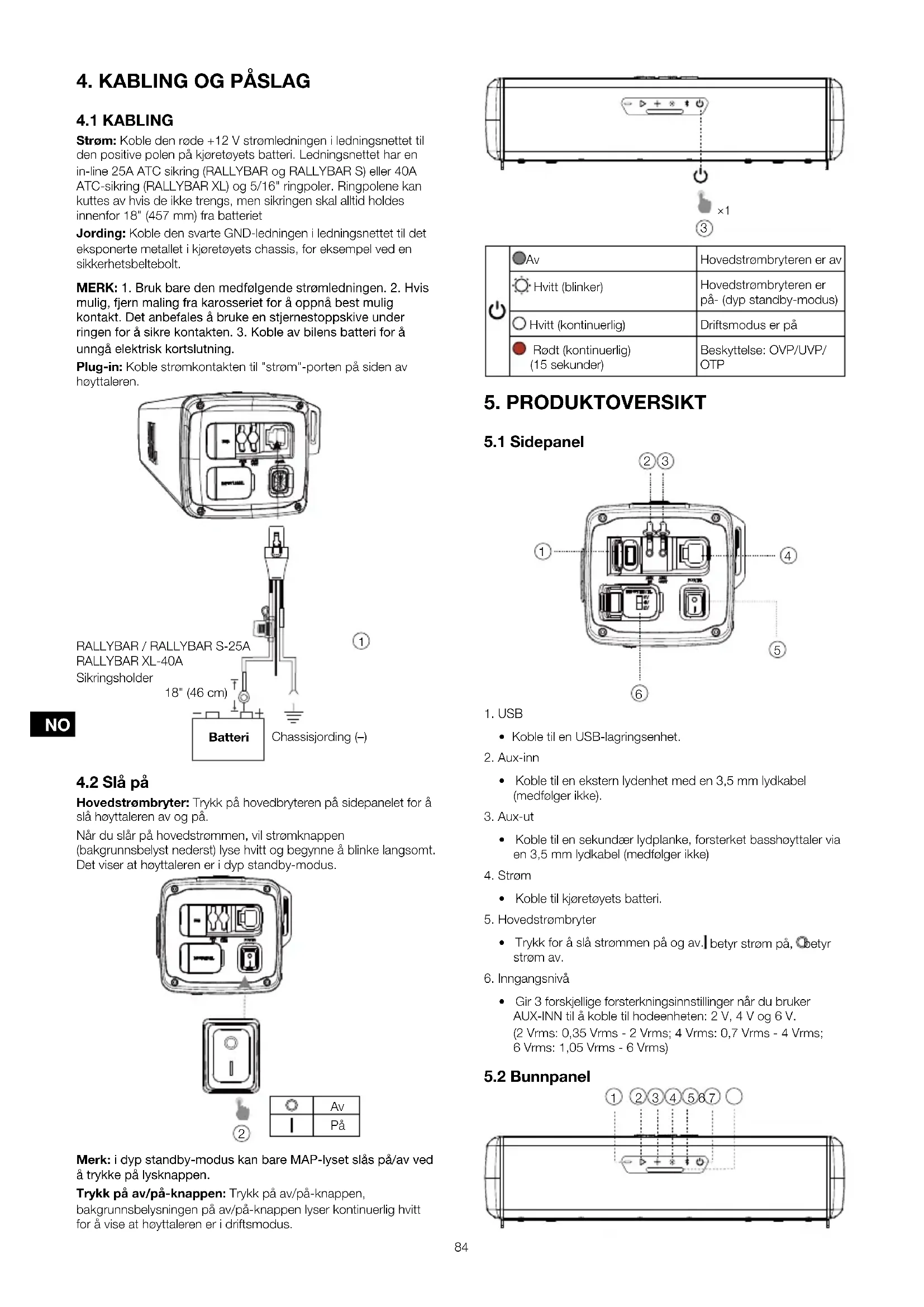 4.1 KABLING Strøm: Koble den røde +12 V strømledningen i ledningsnettet til den positive polen på kjøretøyets batteri. Ledningsnettet har en in-line 25A ATC sikring (RALLYBAR og RALLYBAR S) eller 40A ATC-sikring (RALLYBAR XL) og 5/16" ringpoler. Ringpolene kan kuttes av hvis de ikke trengs, men sikringen skal alltid holdes innenfor 18" (457 mm) fra batterietJording: Koble den svarte GND-ledningen i ledningsnettet til det eksponerte metallet i kjøretøyets chassis, for eksempel ved en sikkerhetsbeltebolt. MERK: 1. Bruk bare den medfølgende strømledningen. 2. Hvis mulig, fjern maling fra karosseriet for å oppnå best mulig kontakt. Det anbefales å bruke en stjernestoppskive under ringen for å sikre kontakten. 3. Koble av bilens batteri for å unngå elektrisk kortslutning.Plug-in: Koble strømkontakten til "strøm"-porten på siden av høyttaleren. WIRING BatteriChassisjording (–) RALLYBAR / RALLYBAR S-25ARALLYBAR XL-40ASikringsholder18" (46 cm) 4.2 Slå påHovedstrømbryter: Trykk på hovedbryteren på sidepanelet for å slå høyttaleren av og på. Når du slår på hovedstrømmen, vil strømknappen (bakgrunnsbelyst nederst) lyse hvitt og begynne å blinke langsomt. Det viser at høyttaleren er i dyp standby-modus. POWER ON
