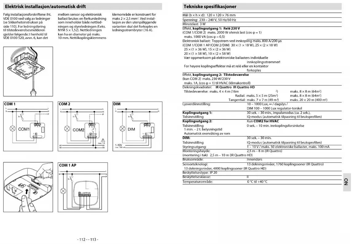 koplingen av kunstig lys er avhen- gig både av dagslysandelen og av tilstedeværelse. Konstant lys ON/OFF NB: Avhengig av monteringssted kan det være nødvendig å korrigere innstillingen med 1-2 trinn på skalaen. Lysstyrken måles på sensoren. DIM NO- 116 - - 117 -