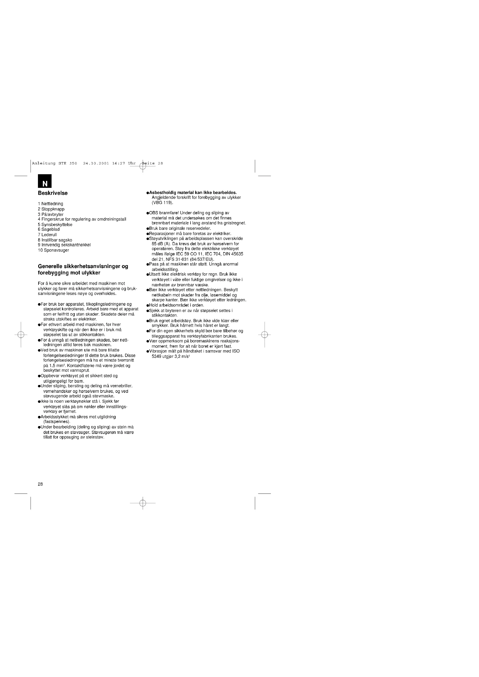 Anleitung STE 350 24.10.2001 16:27 Uhr Seite 2829 Bruksanvisning for elektrisk stikksag STE 350 IGANGSETTELSE Momentkopling (fig 3) Innkopling: på/avbryter trykkes inn Utkopling: på/avbryter slippes Automatisk drift Innkopling: på/avbryter trykkes inn og stoppes med stoppknappen. Utkopling: på/avbryter trykkes inn og slippes. Regulering av omdreiningstall Ved å trykke hardt på på/avbryteren kan omdreining- stallet reguleres trinnløst. Et lett trykk på på/ avbryte- ren gir et lavt omdreiningstall. Et hårdt trykk på på/avbryteren gir et høyt omdreiningstall. På denne måten kan omdreiningstallet endres etter hvilket arbeid som skal utføres. Elektronisk forhåndsinnstilling av omdreiningstall (fig 4). Ønsket omdreiningstall kan velges på forhånd med fingerskruen på på/avbryteren. Når fingerskruen drei- es i PLUS-retning blir omdreiningstallet høyere, drei- es fingerskruen i MINUS-retningen blir omdreining- stallet lavere. Det mest egnede slagtall avhenger av hvilket arbeidsmaterial som blir brukt og arbeidsbe- tingelserne. Generelle regler for sagehurtighet for sponavskillen- de arbeider gjelder også her. Utskifting av sagblad (fig. 2) Før ethvert arbeid med sagen og før utskifting av sagblad må stikksagen slås av og støpselet tas ut av stikkontakten. Løsne de to skruene på støtstangen (fig. 2) med ved- lagte innvendig sekskantnøkkel. Skyv sagbladet inn i ledesporet mellom løftestangen og holdebøylen inntil anslaget. Dra godt til de to skruene med vedlagte innvendige sekskantnøkkel. Tennene på sagbladet må stå i sageretningen. Pass på at sagbladet sitter i ledesporet på støtstangen og lederullen. Innstilling av sagskoen (Gjæringssnitt og saging nær kant, fig 5) For gjæringssnitt og skråsnitt kan sagskoen svinges inntil 45° til begge sider, når de to skruene på undersiden løsnes. Vinklene er markert med strek ved 15°, 30° og 45°. Innstilling mellom de markerte vinklene er fullt mulig. For innstilling av snittvinkelen løsnes de to skruene (fig 5) så mye at sagskoen akkurat kan beveges. Still inn den ønskede vinkelen og dra til de to skruene igjen. For saging inntil kant kan sagskoen skyves bakover. De to skruene på undersiden (fig 5) løsnes og sags- koen skyves bakover. Dra skruene godt til igjen. Støvavsug Stikksagen er forberedt for tilkopling av støvsuger. Alle slags støvsugere kan tilkoples i avsuger- åpningen på baksiden av stikksagen. Dersom det trengs en spesiell adapter, må støvsugerfabrikanten kontaktes. TEKNISKE DATA: Nominell spenning 230 V ~ 50 Hz Effektopptak 350 W Slagtall trinløst regulerbart maks. 3000/min Slaghøyde 18 mm Snittdybde tre 55 mm Snittdybde kunststoff 10 mm Snittdybde jern 5 mm Gjæringssnitt inntil 45° (til venstre og høyre) Lydtrykknivå LPA 89 dB (A) Lydeffektnivå LWA 99,6 dB (A) Vibrasjon a