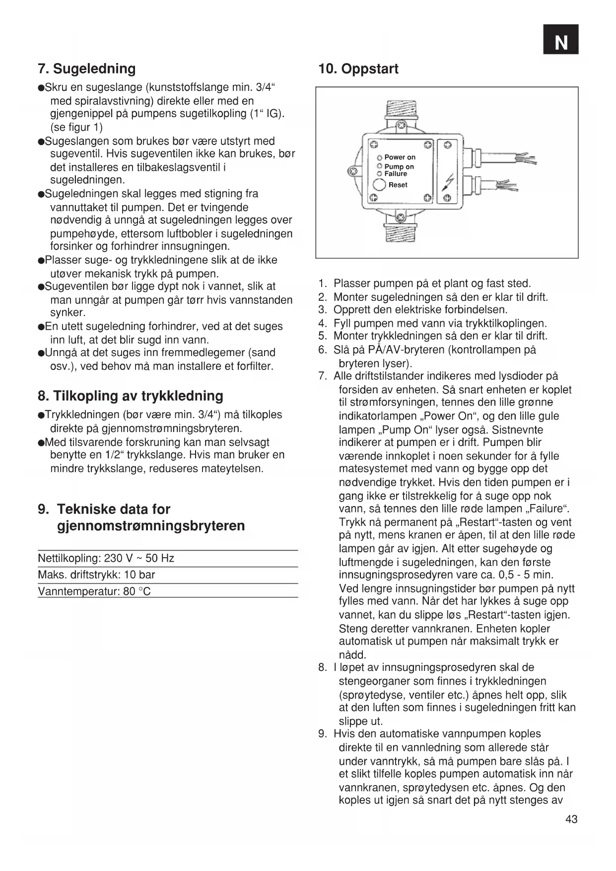 forsiden av enheten. Så snart enheten er koplet til strømforsyningen, tennes den lille grønne indikatorlampen „Power On“, og den lille gule lampen „Pump On“ lyser også. Sistnevnte indikerer at pumpen er i drift. Pumpen blir værende innkoplet i noen sekunder for å fylle matesystemet med vann og bygge opp det nødvendige trykket. Hvis den tiden pumpen er i gang ikke er tilstrekkelig for å suge opp nok vann, så tennes den lille røde lampen „Failure“. Trykk nå permanent på „Restart“-tasten og vent på nytt, mens kranen er åpen, til at den lille røde lampen går av igjen. Alt etter sugehøyde og luftmengde i sugeledningen, kan den første innsugningsprosedyren vare ca. 0,5 - 5 min. Ved lengre innsugningstider bør pumpen på nytt fylles med vann. Når det har lykkes å suge opp vannet, kan du slippe løs „Restart“-tasten igjen. Steng deretter vannkranen. Enheten kopler automatisk ut pumpen når maksimalt trykk er nådd.