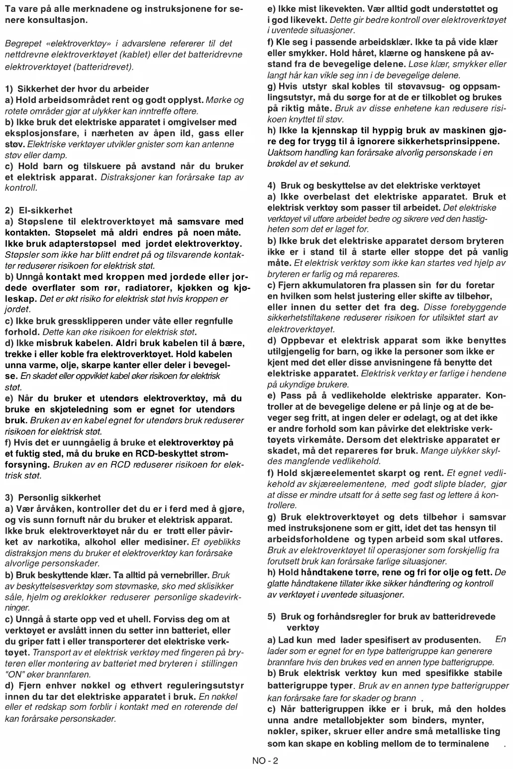 a) Vær årvåken, kontroller det du er i ferd med å gjøre, og vis sunn fornuft når du bruker et elektrisk apparat. Ikke bruk elektroverktøyet når du er trøtt eller påvir- ket av narkotika, alkohol eller medisiner. Et øyeblikks distraksjon mens du bruker et elektroverktøy kan forårsake alvorlige personskader. b) Bruk beskyttende klær. Ta alltid på vernebriller. Bruk av beskyttelsesverktøy som støvmaske, sko med sklisikker såle, hjelm og øreklokker reduserer personlige skadevirk- ninger. c) Unngå å starte opp ved et uhell. Forviss deg om at verktøyet er avslått innen du setter inn batteriet, eller du griper fatt i eller transporterer det elektriske verk- tøyet. Transport av et elektrisk verktøy med ngeren på bry- teren eller montering av batteriet med bryteren i stillingen "ON" øker brannfaren. d) Fjern enhver nøkkel og ethvert reguleringsutstyr innen du tar det elektriske apparatet i bruk. En nøkkel eller et redskap som forblir i kontakt med en roterende del kan forårsake personskader. e) Ikke mist likevekten. Vær alltid godt understøttet og i god likevekt. Dette gir bedre kontroll over elektroverktøyet i uventede situasjoner. f) Kle seg i passende arbeidsklær. Ikke ta på vide klær eller smykker. Hold håret, klærne og hanskene på av- stand fra de bevegelige delene. Løse klær, smykker eller langt hår kan vikle seg inn i de bevegelige delene. g) Hvis utstyr skal kobles til støvavsug- og oppsam- lingsutstyr, må du sørge for at de er tilkoblet og brukes på riktig måte. Bruk av disse enhetene kan redusere risi- koen knyttet til støv. h) Ikke la kjennskap til hyppig bruk av maskinen gjø- re deg for trygg til å ignorere sikkerhetsprinsippene. Uaktsom handling kan forårsake alvorlig personskade i en brøkdel av et sekund.