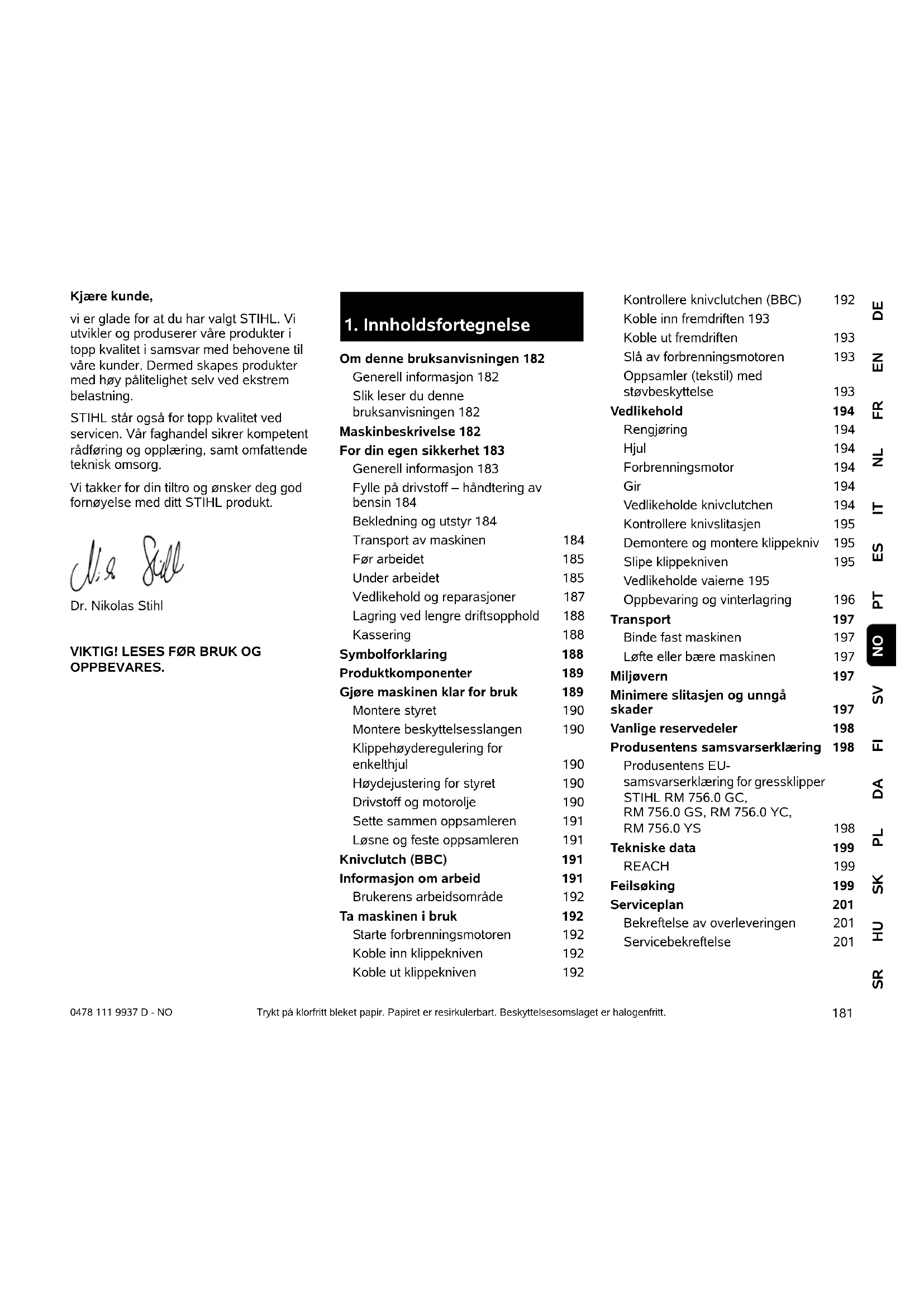 Om denne bruksanvisningen 182 Generell informasjon 182 Slik leser du denne bruksanvisningen 182 Maskinbeskrivelse 182 For din egen sikkerhet 183 Generell informasjon 183 Fylle på drivstoff – håndtering av bensin 184 Bekledning og utstyr 184 Transport av maskinen 184 Før arbeidet 185 Under arbeidet 185 Vedlikehold og reparasjoner 187 Lagring ved lengre driftsopphold 188 Kassering 188 Symbolforklaring 188 Produktkomponenter 189 Gjøre maskinen klar for bruk 189 Montere styret 190 Montere beskyttelsesslangen 190 Klippehøyderegulering for enkelthjul 190 Høydejustering for styret 190 Drivstoff og motorolje 190 Sette sammen oppsamleren 191 Løsne og feste oppsamleren 191 Knivclutch (BBC) 191 Informasjon om arbeid 191 Brukerens arbeidsområde 192 Ta maskinen i bruk 192 Starte forbrenningsmotoren 192 Koble inn klippekniven 192 Koble ut klippekniven 192 Kontrollere knivclutchen (BBC) 192 Koble inn fremdriften 193 Koble ut fremdriften 193 Slå av forbrenningsmotoren 193 Oppsamler (tekstil) med støvbeskyttelse 193 Vedlikehold 194 Rengjøring 194 Hjul 194 Forbrenningsmotor 194 Gir 194 Vedlikeholde knivclutchen 194 Kontrollere knivslitasjen 195 Demontere og montere klippekniv 195 Slipe klippekniven 195 Vedlikeholde vaierne 195 Oppbevaring og vinterlagring 196 Transport 197 Binde fast maskinen 197 Løfte eller bære maskinen 197 Miljøvern 197 Minimere slitasjen og unngå skader 197 Vanlige reservedeler 198 Produsentens samsvarserklæring 198 Produsentens EU- samsvarserklæring for gressklipper STIHL RM 756.0 GC, RM 756.0 GS, RM 756.0 YC, RM 756.0 YS 198 Tekniske data 199 REACH 199 Feilsøking 199 Serviceplan 201 Bekreftelse av overleveringen 201 Servicebekreftelse 2010478 111 9937 D - NO
