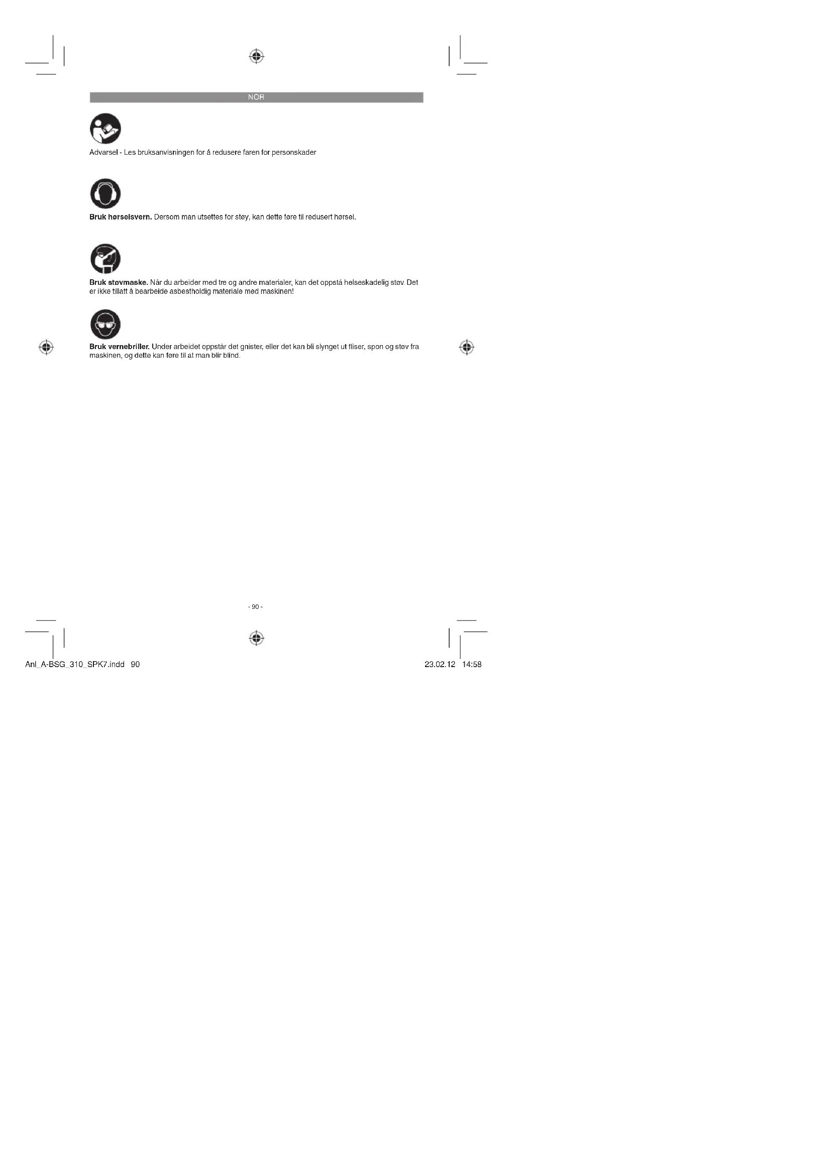 Advarsel - Les bruksanvisningen for å redusere faren for personskader Bruk hørselsvern. Dersom man utsettes for støy, kan dette føre til redusert hørsel. Bruk vernebriller. Under arbeidet oppstår det gnister, eller det kan bli slynget ut fl iser, spon og støv fra maskinen, og dette kan føre til at man blir blind. Bruk støvmaske. Når du arbeider med tre og andre materialer, kan det oppstå helseskadelig støv. Det er ikke tillatt å bearbeide asbestholdig materiale med maskinen! Anl_A-BSG_310_SPK7.indd 90Anl_A-BSG_310_SPK7.indd 90 23.02.12 14:5823.02.12 14:58NOR