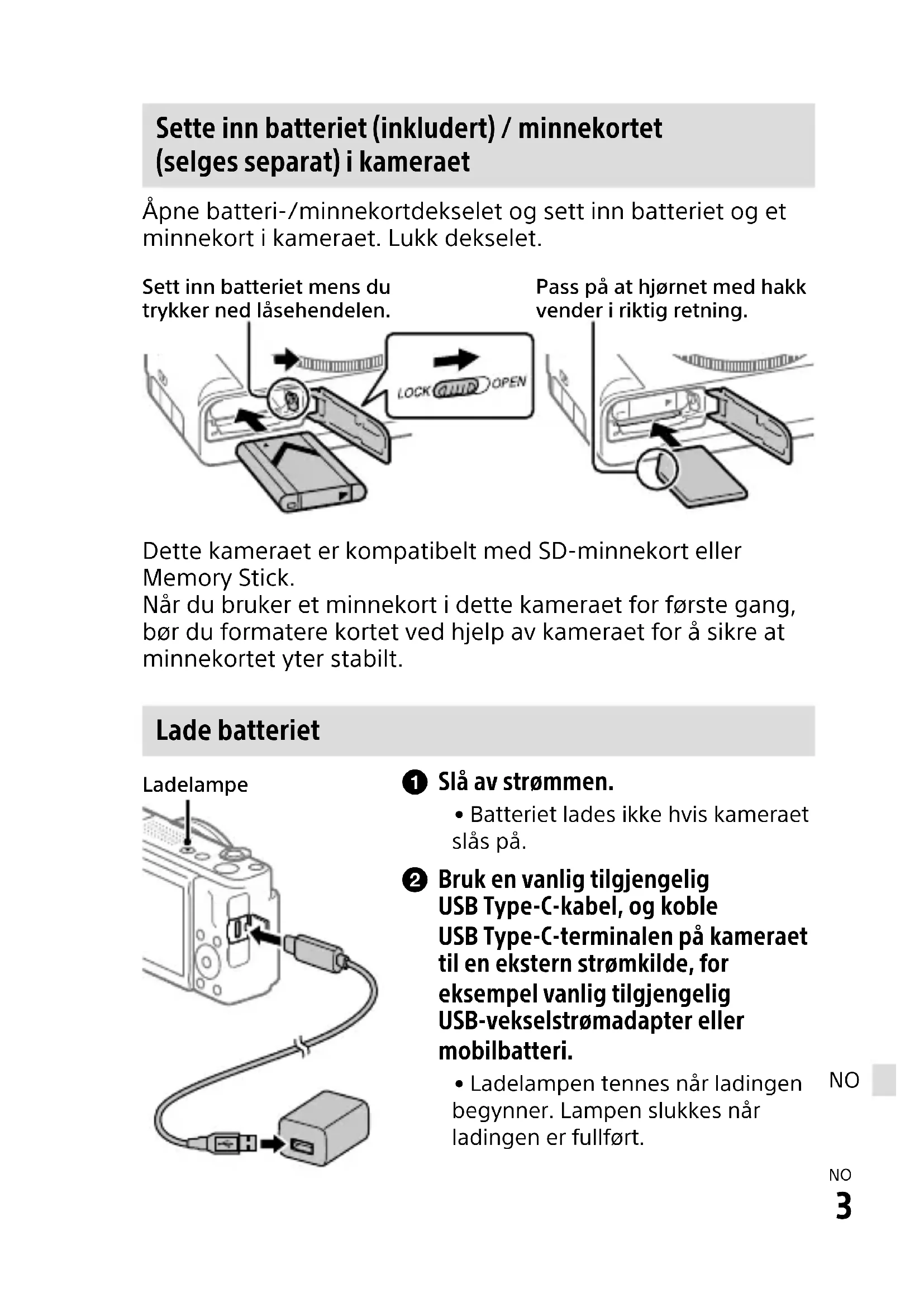 Sette inn batteriet (inkludert) / minnekortet (selges separat) i kameraet Åpne batteri-/minnekortdekselet og sett inn batteriet og et minnekort i kameraet. Lukk dekselet. Sett inn batteriet mens du trykker ned låsehendelen.Pass på at hjørnet med hakk vender i riktig retning. Dette kameraet er kompatibelt med SD-minnekort eller Memory Stick. Når du bruker et minnekort i dette kameraet for første gang, bør du formatere kortet ved hjelp av kameraet for å sikre at minnekortet yter stabilt. Lade batteriet Ladelampe