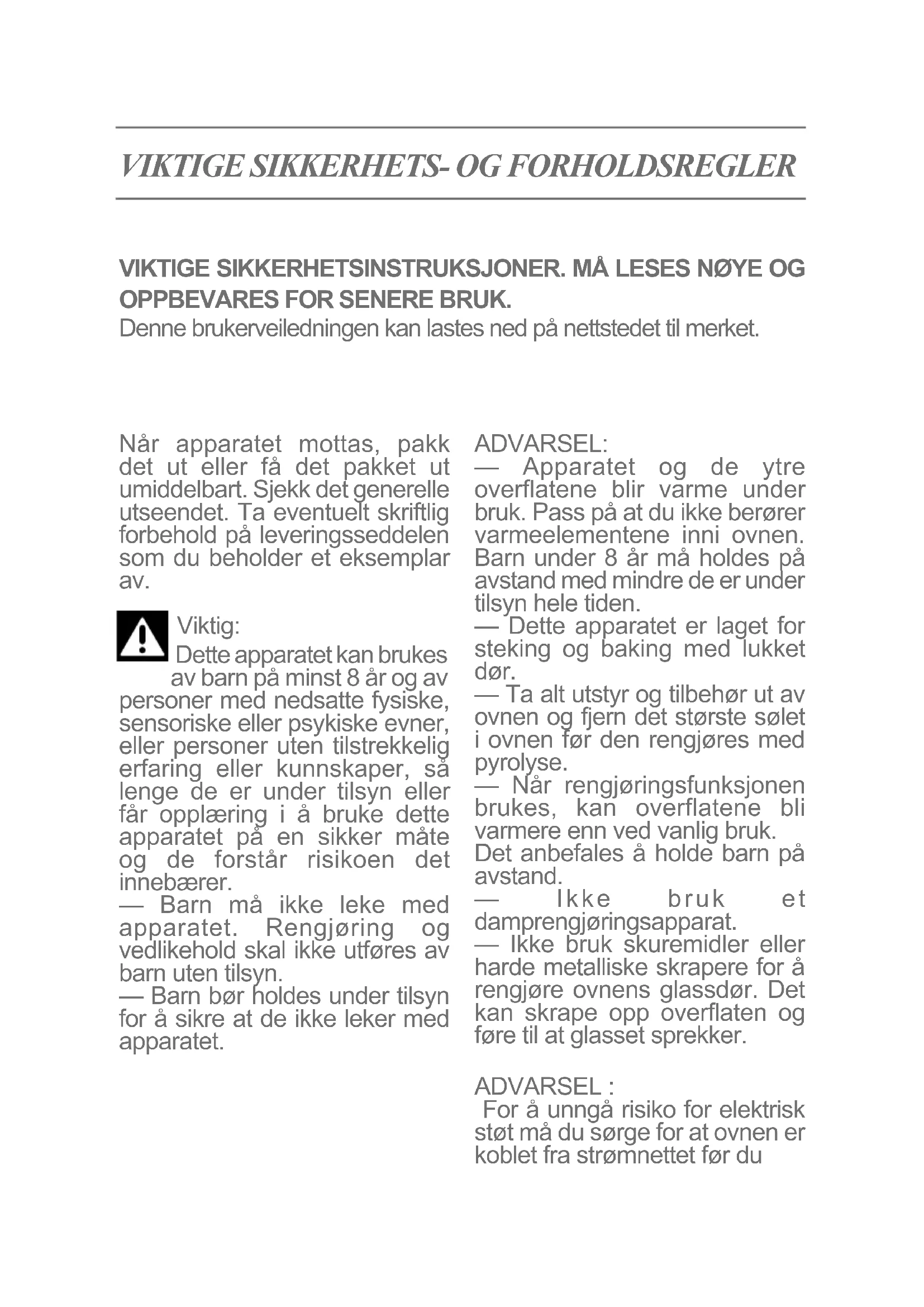 VIKTIGE SIKKERHETSINSTRUKSJONER. MÅ LESES NØYE OG OPPBEVARES FOR SENERE BRUK. Denne brukerveiledningen kan lastes ned på nettstedet til merket.VIKTIGE SIKKERHETS- OG FORHOLDSREGLER skifter lyspære. Bytt lyspære når ovnen er avkjølt. Når du skal skru av lampens beskyttelsesglass og lyspæren, er det enklere å få bedre grep hvis du bruker gummihansker. Stikkontakten må kunne nås etter at ovnen er installert. Det må være mulig å frakoble apparatet fra strømnettet, enten ved hjelp av støpselet, eller ved å installere en bryter på de faststående rørene i samsvar med installasjonsreglene. — Hvis strømledningen er skadet, må den av sikkerhetsmessige årsaker erstattes av produsenten, dens kundeservice eller av en person med lignende kvalifikasjoner. — Dette apparatet kan installeres både under arbeidsbenken eller i et høyskap som forklart på installasjonstegningen. — Sett ovnen i innredningen slik at det er minst 10 mm avstand mellom ovnen og skapet ved siden av. Innredningen som ovnen skal bygges inn i, må tåle høye temperaturer eller være belagt med et materiale som tåler høye temperaturer. For at ovnen skal bli så stabil som mulig, bør du montere den fast i innredningen med to skruer som skrus inn i hullene på sidestolpene. — For å unngå overoppheting skal apparatet ikke installeres bak en pyntedør. — Dette apparatet er beregnet til bruk i hjemmet og lignende steder, f.eks. i et kjøkken forbeholdt personalet i butikker, på kontorer og andre arbeidsplasser, på gårdsbruk, eller tilgjengelig for kunder på hotell, motell og andre steder med hjemlig preg, eller på rom av typen bed & breakfast. — Ovnen skal alltid slås av før den rengjøres innvendig. Dette apparatets karakteristikker må av sikkerhetsmessige hensyn ikke endres. Ikke bruk ovnen til oppbevaring av matvarer eller annet utstyr etter bruk.583