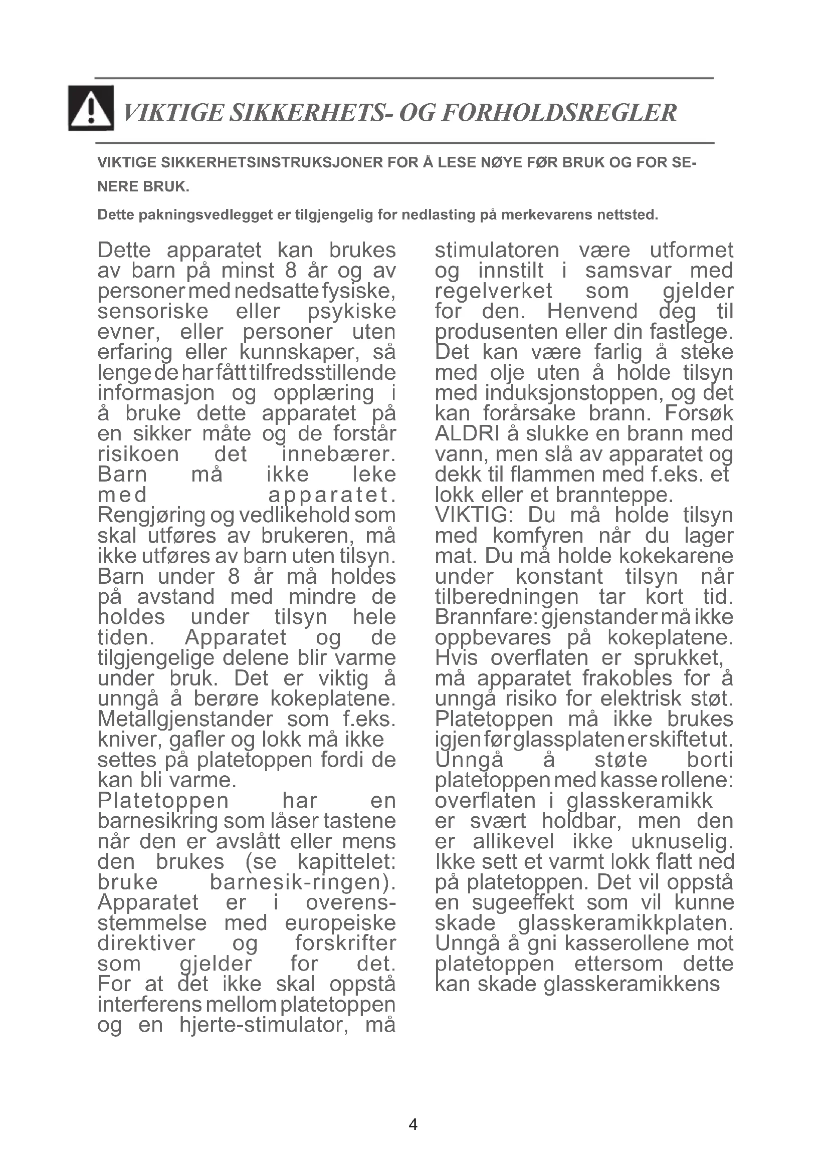 Dette apparatet kan brukes av barn på minst 8 år og av personer med nedsatte fysiske, sensoriske eller psykiske evner, eller personer uten erfaring eller kunnskaper, så lenge de har fått tilfredsstillende informasjon og opplæring i å bruke dette apparatet på en sikker måte og de forstår risikoen det innebærer. Barn må ikke leke med apparatet. Rengjøring og vedlikehold som skal utføres av brukeren, må ikke utføres av barn uten tilsyn. Barn under 8 år må holdes på avstand med mindre de holdes under tilsyn hele tiden. Apparatet og de tilgjengelige delene blir varme under bruk. Det er viktig å unngå å berøre kokeplatene. Metallgjenstander som f.eks. kniver, gaer og lokk må ikke settes på platetoppen fordi de kan bli varme. Platetoppen har en barnesikring som låser tastene når den er avslått eller mens den brukes (se kapittelet: bruke barnesik-ringen). Apparatet er i overens- stemmelse med europeiske direktiver og forskrifter som gjelder for det. For at det ikke skal oppstå interferens mellom platetoppen og en hjerte-stimulator, må stimulatoren være utformet og innstilt i samsvar med regelverket som gjelder for den. Henvend deg til produsenten eller din fastlege. Det kan være farlig å steke med olje uten å holde tilsyn med induksjonstoppen, og det kan forårsake brann. Forsøk ALDRI å slukke en brann med vann, men slå av apparatet og dekk til ammen med f.eks. et lokk eller et brannteppe. VIKTIG: Du må holde tilsyn med komfyren når du lager mat. Du må holde kokekarene under konstant tilsyn når tilberedningen tar kort tid. Brannfare: gjenstander må ikke oppbevares på kokeplatene. Hvis overaten er sprukket, må apparatet frakobles for å unngå risiko for elektrisk støt. Platetoppen må ikke brukes igjen før glassplaten er skiftet ut. Unngå å støte borti platetoppen med kasse rollene: overaten i glasskeramikk er svært holdbar, men den er allikevel ikke uknuselig. Ikke sett et varmt lokk att ned på platetoppen. Det vil oppstå en sugeeekt som vil kunne skade glasskeramikkplaten. Unngå å gni kasserollene mot platetoppen ettersom dette kan skade glasskeramikkens5