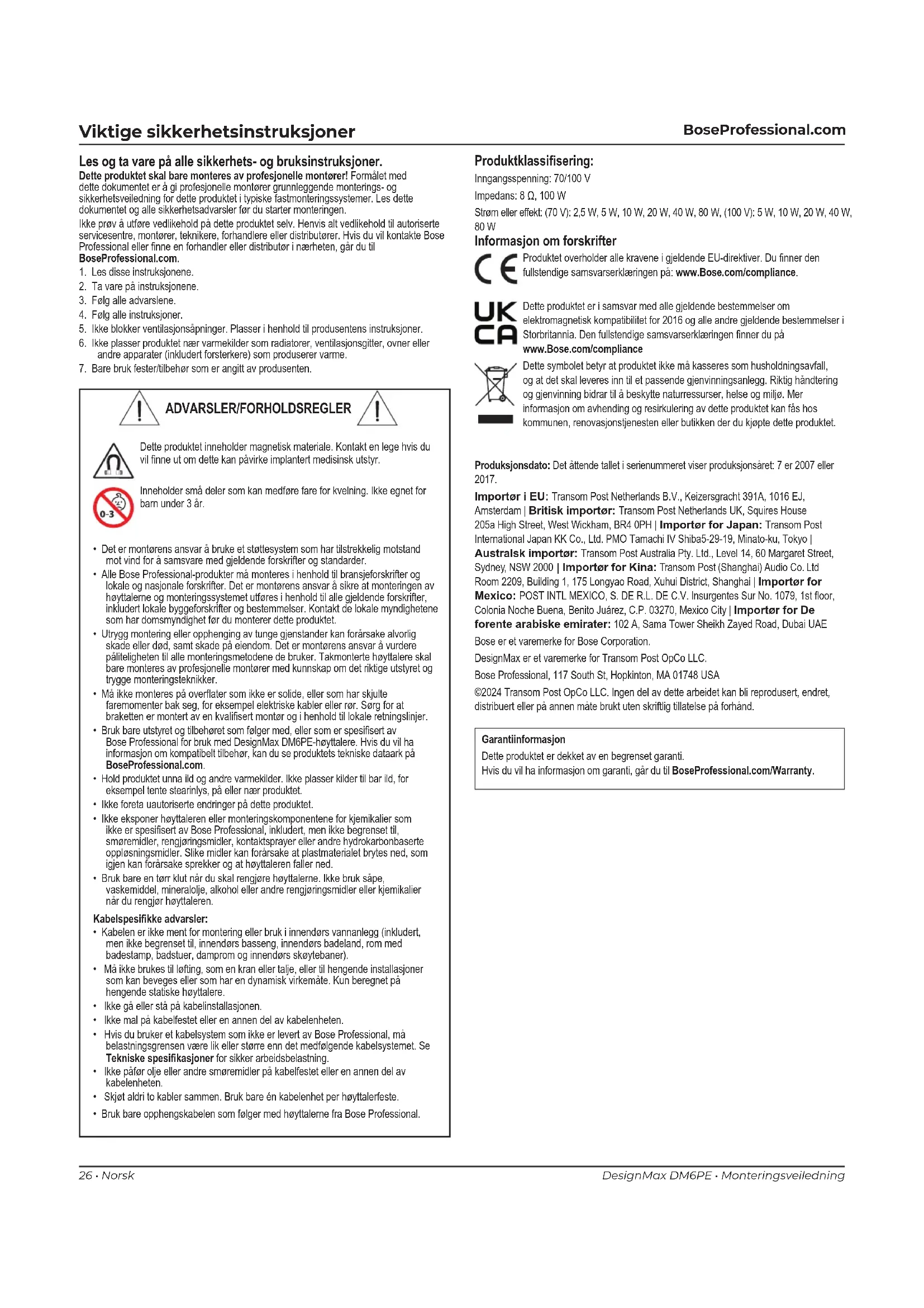 Informasjon om forskrifter Produktet overholder alle kravene i gjeldende EU-direktiver. Du nner den fullstendige samsvarserklæringen på: www.Bose.com/compliance. Dette produktet er i samsvar med alle gjeldende bestemmelser om elektromagnetisk kompatibilitet for 2016 og alle andre gjeldende bestemmelser i Storbritannia. Den fullstendige samsvarserklæringen nner du på www.Bose.com/compliance Dette symbolet betyr at produktet ikke må kasseres som husholdningsavfall, og at det skal leveres inn til et passende gjenvinningsanlegg. Riktig håndtering og gjenvinning bidrar til å beskytte naturressurser, helse og miljø. Mer informasjon om avhending og resirkulering av dette produktet kan fås hos kommunen, renovasjonstjenesten eller butikken der du kjøpte dette produktet. Produksjonsdato: Det åttende tallet i serienummeret viser produksjonsåret: 7 er 2007 eller