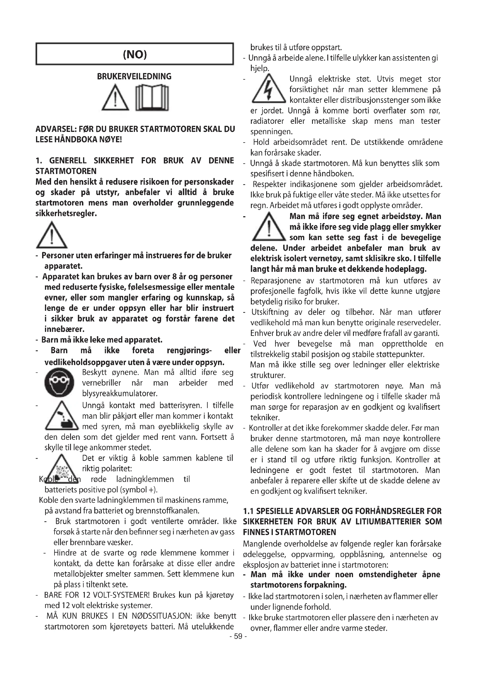 Manglende overholdelse av følgende regler kan forårsake ødeleggelse, oppvarming, oppblåsning, antennelse og eksplosjon av batteriet inne i startmotoren: - Man må ikke under noen omstendigheter åpne startmotorens forpakning. - Ikke lad startmotoren i solen, i nærheten av ammer eller under lignende forhold. - Ikke bruke startmotoren eller plassere den i nærheten av ovner, ammer eller andre varme steder.- 60 - - Lad startmotoren utelukkende ved å bruke laderen som følger med apparatet. - Ikke kast startmotoren inn i ammer eller varme den opp. - Ikke bytt om på terminalpolaritetene positiv “+” og negativ “-”. - Ikke kortslutt startmotorens terminaler. - Ikke stikk hull på startmotorens forpakning, ikke dekk den til med metall, ikke tråkk på den. - Ikke plasser startmotoren inne i ovner, mikrobølgeovner, etc. - Ikke hiv startmotoren eller forårsak kraftige støt. - Ikke tukle med eller endre på startmotorens forpakning. - Hvis det, i løpet av bruk, kommer rar lukt fra startmotoren under lading eller oppbevaring, hvis apparatet varmes opp eller deformeres, må det ikke benyttes. - Hvis startmotoren lekker syre eller det kommer rar lukt, må man umiddelbart erne apparatet fra varmekilder eller fra åpne ammer. - I tilfelle kontakt med startmotorens batterisyre på huden eller på klærne, må man øyeblikkelig skylle av med store mengder vann. - I tilfelle kontakt med startmotorens batterisyre i øynene, må man øyeblikkelig skylle av med store mengder vann og kontakte lege. Ta vare på denne håndboken. Håndboken er nødvendig for å kunne forstå advarslene og forholdsreglene med hensyn til sikkerheten, for prosedyrene for bruk og vedlikehold og for liste over komponenter og de tekniske spesikasjonene. Ta vare på håndboken på et sikkert og tørt sted for å kunne rådføre seg med den i fremtiden.