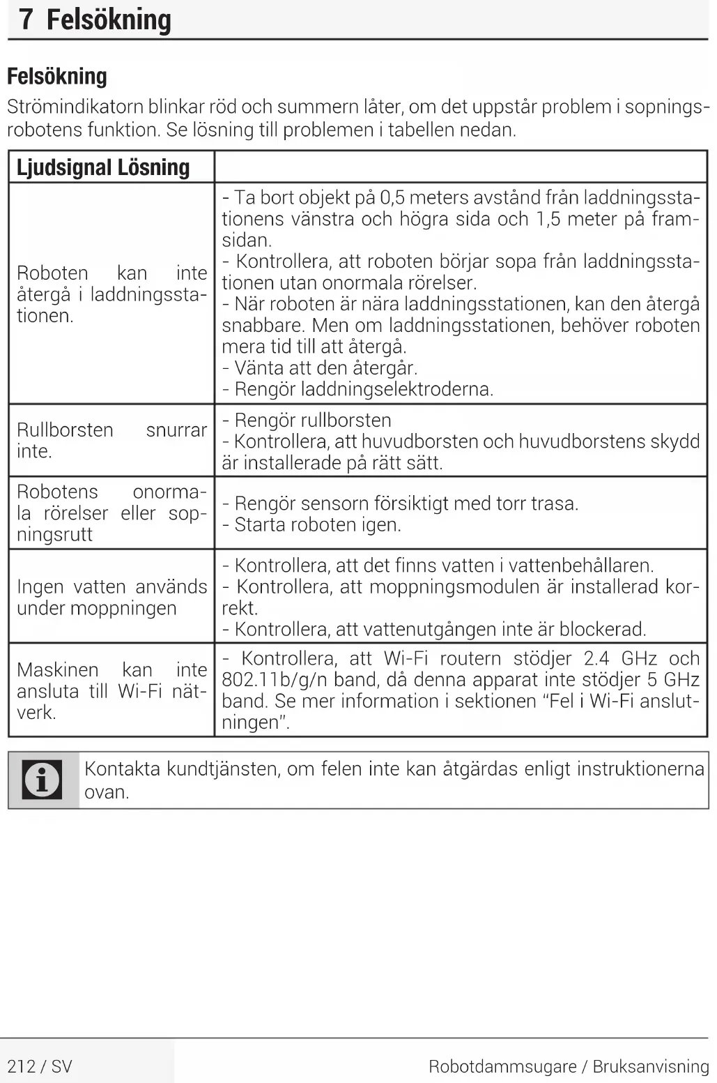 6 Rengjøring og vedlikehold239 / NO Robotstøvsuger/Bruksanvisning Feilsøking Strømindikatoren vil blinke rødt og summeren vil gi et pip i tilfelle det er en unormal- itet i feierobotens drift. Sjekk tabellen nedenfor for å løse problemene dine. Talemeldinger Løsning Roboten kan ikke starte. - Sørg for at roboten er koblet til strømforsyningen. - Forsikre deg om at batteriet er fulladet. - Hvis problemet vedvarer, må du tilbakestille roboten. Roboten slutter plutselig å virke. - Sjekk om roboten sitter fast eller blokkert av hindringer. - Sjekk om batteriet er for lavt. - Hvis problemet vedvarer, slå den av, vent i 3 sekunder og start den på nytt. Kan ikke foreta en feie- rute – Det er for mange hindringer rundt ladestasjonen. Plass- er ladestasjonen i et område fritt for hindringer. - Robotstøvsugeren er for langt unna ladestasjonen. Før robotstøvsugeren nærmere ladestasjonen og prøv igjen. - Sørg for at ladestasjonen er koblet til og at det er strøm. Sug for svakt - Kontroller sugeinntaket for eventuelle hindringer. - Tøm søppelkassen. - Rengjør filtrene med vann. - Sjekk om filtrene er våte på grunn av vann eller andre væsker på gulvet. La filtrene tørke naturlig grundig før bruk. Kan ikke lade maski- nen - Kontroller om ladestasjonen er riktig koblet til strøm- forsyningen, og indikatorlampen lyser når strømmen er på. - Indikatorlampen slukker når roboten er normalt koblet til ladestasjonen. - Hvis roboten er koblet til ladestasjonen, men indikator- lyset ikke slukker og roboten ikke reagerer, bruk en tørr klut til å tørke av ladestasjonen nederst på robotstøvsug- eren og ladestykket på ladestasjon, og prøv på nytt. - Hvis roboten fortsatt ikke kan lades etter å ha utført operasjonene ovenfor, kontakt ettersalgsavdelingen eller forhandleren din. 7 Feilsøking240 / NO Robotstøvsuger/Bruksanvisning 7 Feilsøking Feilsøking Strømindikatoren vil blinke rødt og summeren vil gi et pip i tilfelle at det er en unor- malitet i feierobotens drift. Sjekk tabellen nedenfor for å løse problemene dine. Talemeldinger Løsning Roboten kan ikke gå tilbake til ladestasjo- nen. - Fjern gjenstander ved ladestasjonen innen 0,5 m på venstre og høyre side og innen 1,5 m foran. - Sørg for at roboten begynner å feie fra ladestasjonen uten unormale bevegelser. – Når roboten er i nærheten av ladetasjonen, kan den re- turnere raskere. Men hvis ladestasjonen er plassert langt unna, vil roboten bruker lengre tid på å returnere. - Vent under returen. - Rengjør ladeelektrodene. Rullebørsten roterer ikke - Rengjør rullebørsten. - Sjekk om hovedbørsten og hovedbørstedekselet er rik- tig installert. Unormal virkemåte eller feierute for robo- ten - Rengjør sensoren forsiktig med en tørr klut. - Start roboten på nytt. Det frigjøres ikke vann under mopping - Sørg for at det er nok vann i vanntanken. -Sjekk om moppemodulen er riktig installert. - Sjekk om vannutløpet er blokkert. Maskinen kan ikke ko- ble til Wi-Fi-nettverket. - Sørg for at Wi-Fi-ruteren din støtter 2,4 GHz- og 802.11b/g/n-båndene, siden dette utstyret ikke støtter 5 GHz-båndene. Du finner mer informasjon i avsnittet «Feil i Wi-Fi-tilkobling» her.