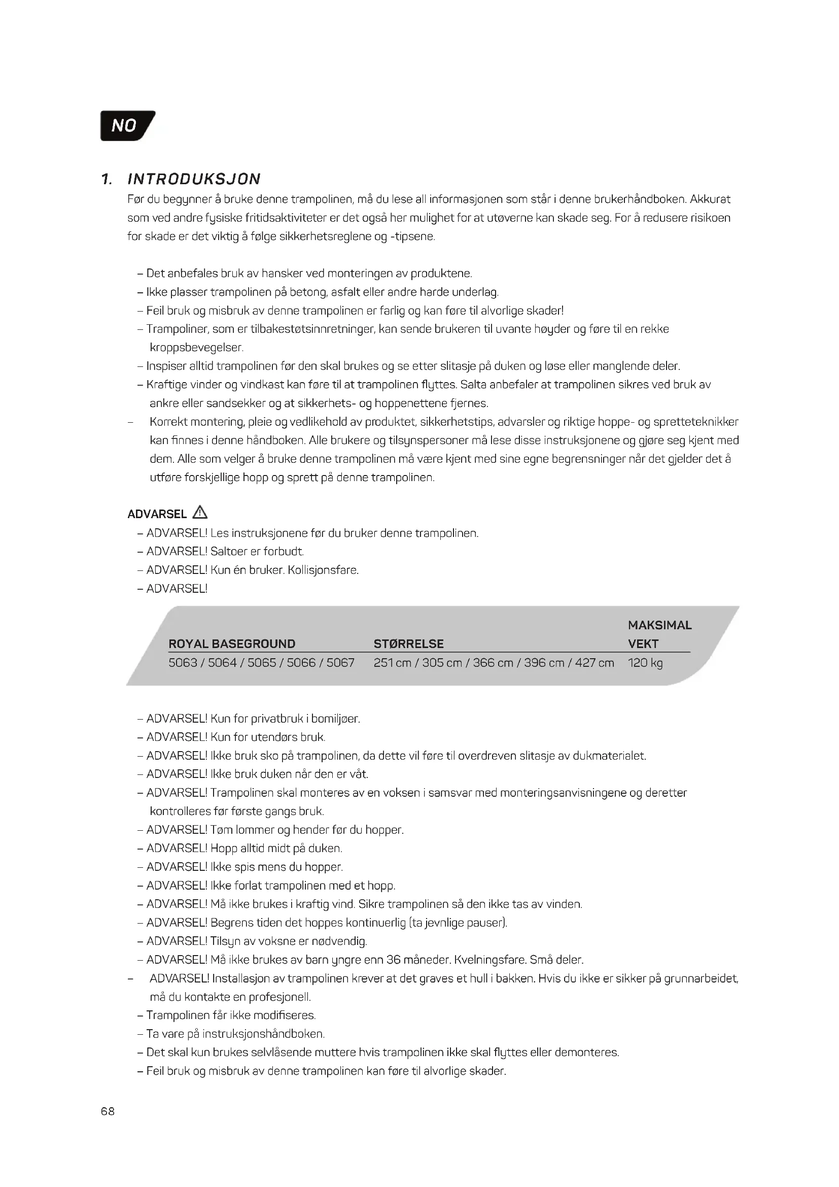 Før du begynner å bruke denne trampolinen, må du lese all informasjonen som står i denne brukerhåndboken. Akkurat som ved andre fysiske fritidsaktiviteter er det også her mulighet for at utøverne kan skade seg. For å redusere risikoen for skade er det viktig å følge sikkerhetsreglene og -tipsene. – Det anbefales bruk av hansker ved monteringen av produktene. – Ikke plasser trampolinen på betong, asfalt eller andre harde underlag. – Feil bruk og misbruk av denne trampolinen er farlig og kan føre til alvorlige skader! – Trampoliner, som er tilbakestøtsinnretninger, kan sende brukeren til uvante høyder og føre til en rekke kroppsbevegelser. – Inspiser alltid trampolinen før den skal brukes og se etter slitasje på duken og løse eller manglende deler. – Kraftige vinder og vindkast kan føre til at trampolinen flyttes. Salta anbefaler at trampolinen sikres ved bruk av ankre eller sandsekker og at sikkerhets- og hoppenettene fjernes. – Korrekt montering, pleie og vedlikehold av produktet, sikkerhetstips, advarsler og riktige hoppe- og spretteteknikker kan finnes i denne håndboken. Alle brukere og tilsynspersoner må lese disse instruksjonene og gjøre seg kjent med dem. Alle som velger å bruke denne trampolinen må være kjent med sine egne begrensninger når det gjelder det å utføre forskjellige hopp og sprett på denne trampolinen. ADVARSEL – ADVARSEL! Les instruksjonene før du bruker denne trampolinen. – ADVARSEL! Saltoer er forbudt. – ADVARSEL! Kun én bruker. Kollisjonsfare. – ADVARSEL!