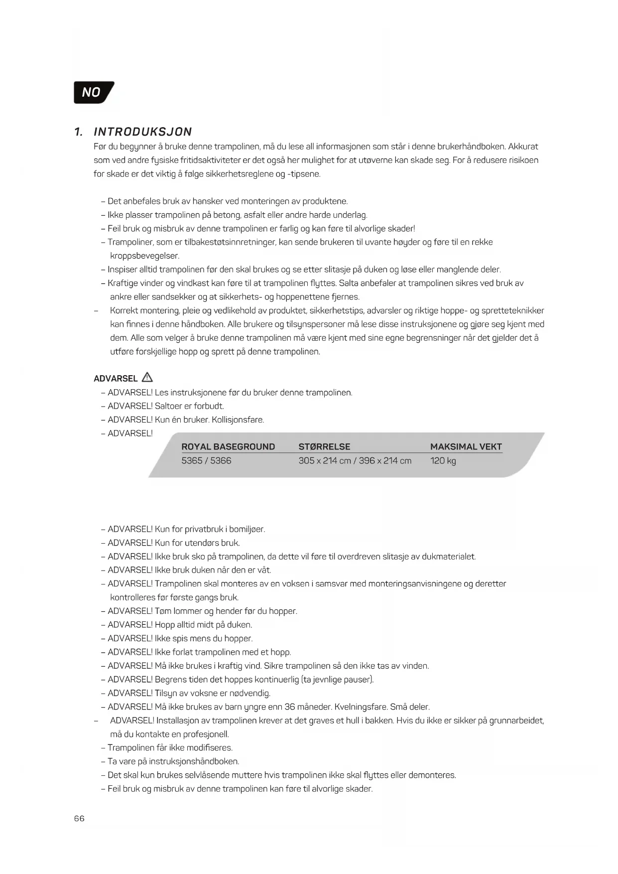 Før du begynner å bruke denne trampolinen, må du lese all informasjonen som står i denne brukerhåndboken. Akkurat som ved andre fysiske fritidsaktiviteter er det også her mulighet for at utøverne kan skade seg. For å redusere risikoen for skade er det viktig å følge sikkerhetsreglene og -tipsene. – Det anbefales bruk av hansker ved monteringen av produktene. – Ikke plasser trampolinen på betong, asfalt eller andre harde underlag. – Feil bruk og misbruk av denne trampolinen er farlig og kan føre til alvorlige skader! – Trampoliner, som er tilbakestøtsinnretninger, kan sende brukeren til uvante høyder og føre til en rekke kroppsbevegelser. – Inspiser alltid trampolinen før den skal brukes og se etter slitasje på duken og løse eller manglende deler. – Kraftige vinder og vindkast kan føre til at trampolinen flyttes. Salta anbefaler at trampolinen sikres ved bruk av ankre eller sandsekker og at sikkerhets- og hoppenettene fjernes. – Korrekt montering, pleie og vedlikehold av produktet, sikkerhetstips, advarsler og riktige hoppe- og spretteteknikker kan finnes i denne håndboken. Alle brukere og tilsynspersoner må lese disse instruksjonene og gjøre seg kjent med dem. Alle som velger å bruke denne trampolinen må være kjent med sine egne begrensninger når det gjelder det å utføre forskjellige hopp og sprett på denne trampolinen. ADVARSEL – ADVARSEL! Les instruksjonene før du bruker denne trampolinen. – ADVARSEL! Saltoer er forbudt. – ADVARSEL! Kun én bruker. Kollisjonsfare. – ADVARSEL!