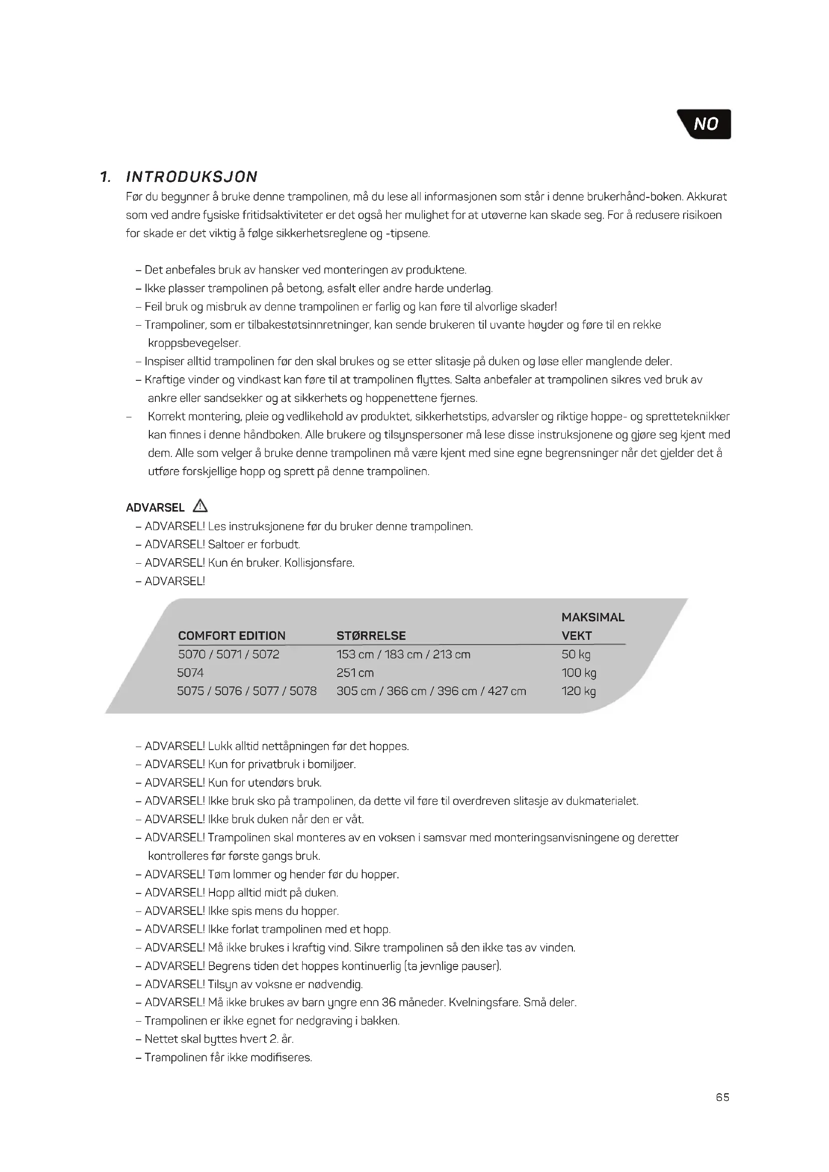 5075 / 5076 / 5077 / 5078 STØRRELSE 153 cm / 183 cm / 213 cm 251 cm 305 cm / 366 cm / 396 cm / 427 cm MAKSIMAL VEKT 50 kg 100 kg 120 kg !66 – Ta vare på instruksjonshåndboken. – Det skal kun brukes selvlåsende muttere hvis trampolinen ikke skal flyttes eller demonteres. – Feil bruk og misbruk av denne trampolinen kan føre til alvorlige skader. – Inspiser trampolinen før bruk og bytt ut slitte, defekte eller manglende deler. – Følg alle sikkerhetskrav og -instruksjoner som følger dette produktet. – Må ikke brukes av barn yngre enn 36 måneder, på grunn av manglende motorikk og evner. – Må holdes unna åpen ild. – Ikke heng fra, spark i, skjær i eller klatre på sikkerhetsnettet. – Bruk klær som ikke har løse snorer, løkker eller annet som kan feste seg i sikkerhetsnettet. – Ikke fest noe til sikkerhetsnettet som ikke er et tilbehør godkjent av produsenten eller som er en del av avstengingssystemet. – Gå kun inn og ut av innhegningen gjennom døren eller åpninger designet og tiltenkt for dette formålet. – Rådfør deg alltid med en lege før du utfører fysisk aktivitet.