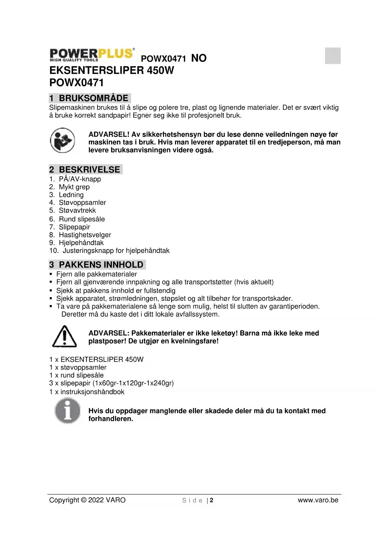Copyright © 2022 VARO S i d e | 2 www.varo.be EKSENTERSLIPER 450W POWX0471 1 BRUKSOMRÅDE Slipemaskinen brukes til å slipe og polere tre, plast og lignende materialer. Det er svært viktig å bruke korrekt sandpapir! Egner seg ikke til profesjonelt bruk. ADVARSEL! Av sikkerhetshensyn bør du lese denne veiledningen nøye før maskinen tas i bruk. Hvis man leverer apparatet til en tredjeperson, må man levere bruksanvisningen videre også. 2 BESKRIVELSE