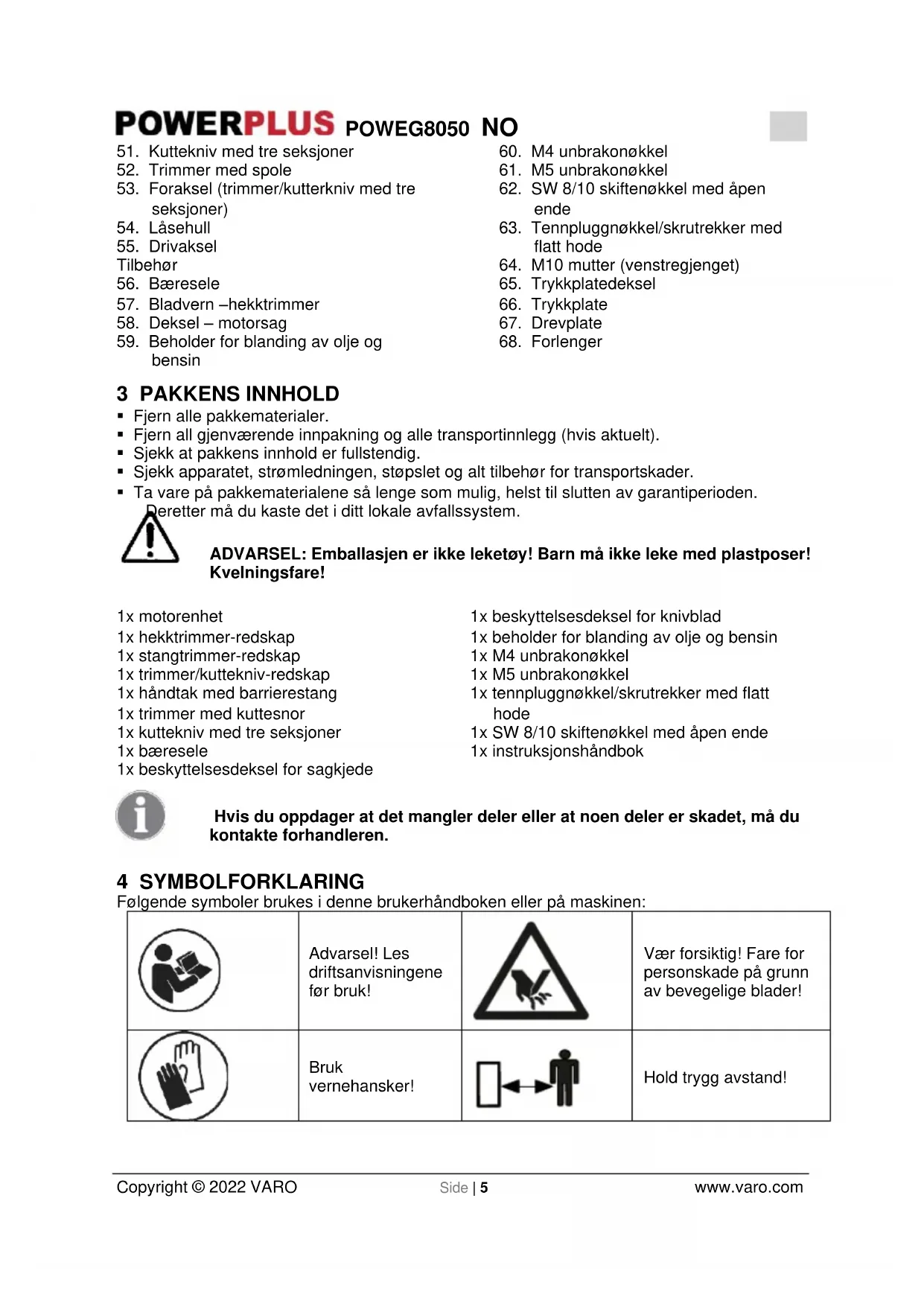 - Plastdekslet for kuttekniven med tre seksjoner (51) må monteres før transport og oppbevaring.POWEG8050 NO Copyright © 2022 VARO Side | 22 www.varo.com