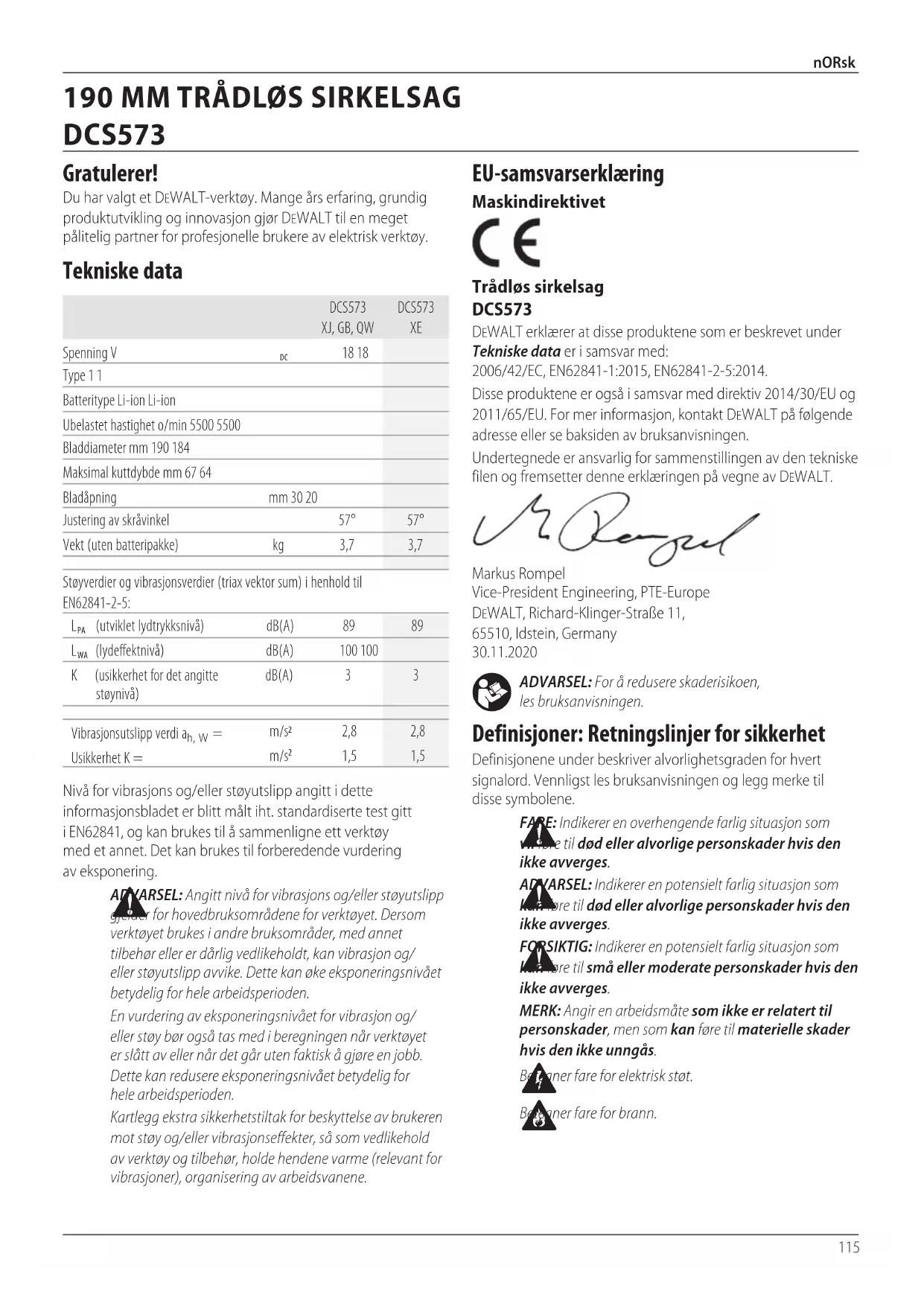 nORsk ADVARSEL: For å redusere skaderisikoen, lesbruksanvisningen. Definisjoner: Retningslinjer for sikkerhet Definisjonene under beskriver alvorlighetsgraden for hvert signalord. Vennligst les bruksanvisningen og legg merke til dissesymbolene. FARE: Indikerer en overhengende farlig situasjon som vil føre til død eller alvorlige personskader hvis den ikkeavverges. ADVARSEL: Indikerer en potensielt farlig situasjon som kan føre til død eller alvorlige personskader hvis den ikkeavverges. FORSIKTIG: Indikerer en potensielt farlig situasjon som kan føre til små eller moderate personskader hvis den ikkeavverges. MERK: Angir en arbeidsmåte som ikke er relatert til personskader, men som kan føre til materielle skader hvis den ikkeunngås. Betegner fare for elektriskstøt. Betegner fare forbrann. EU‑samsvarserklæring Maskindirektivet Trådløs sirkelsag DCS573 DeWALT erklærer at disse produktene som er beskrevet under Tekniske data er i samsvar med: 2006/42/EC, EN62841‑1:2015, EN62841‑2‑5:2014.Disse produktene er også i samsvar med direktiv 2014/30/EU og 2011/65/EU. For mer informasjon, kontakt DeWALT på følgende adresse eller se baksiden avbruksanvisningen.Undertegnede er ansvarlig for sammenstillingen av den tekniske filen og fremsetter denne erklæringen på vegne avDeWALT.Markus Rompel Vice‑President Engineering, PTE‑Europe DeWALT, Richard‑Klinger‑Straße 11, 65510, Idstein, Germany 30.11.2020Nivå for vibrasjons og/eller støyutslipp angitt i dette informasjonsbladet er blitt målt iht. standardiserte test gitt EN62841, og kan brukes til å sammenligne ett verktøy med et annet. Det kan brukes til forberedende vurdering aveksponering. ADVARSEL: Angitt nivå for vibrasjons og/eller støyutslipp gjelder for hovedbruksområdene for verktøyet. Dersom verktøyet brukes i andre bruksområder, med annet tilbehør eller er dårlig vedlikeholdt, kan vibrasjon og/eller støyutslipp avvike. Dette kan øke eksponeringsnivået betydelig for helearbeidsperioden.En vurdering av eksponeringsnivået for vibrasjon og/eller støy bør også tas med i beregningen når verktøyet er slått av eller når det går uten faktisk å gjøre en jobb. Dette kan redusere eksponeringsnivået betydelig for helearbeidsperioden.Kartlegg ekstra sikkerhetstiltak for beskyttelse av brukeren mot støy og/eller vibrasjonseffekter, så som vedlikehold av verktøy og tilbehør, holde hendene varme (relevant for vibrasjoner), organisering avarbeidsvanene.DCS573 XJ, GB, QWDCS573 Spenning V 18 18Type 1 1Batteritype Li‑ion Li‑ionUbelastet hastighet o/min 5500 5500Bladdiameter mm 190 184Maksimal kuttdybde mm 67 64Bladåpning mm 30 20Justering av skråvinkel 57° 57° Vekt (uten batteripakke) kg 3,7 3,7 Støyverdier og vibrasjonsverdier (triax vektor sum) i henhold til EN62841‑2‑5: