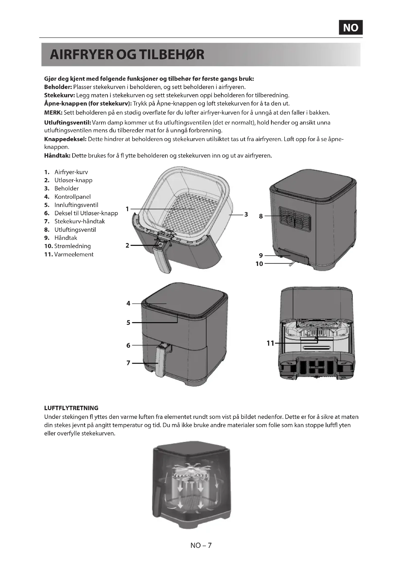 Gjør deg kjent med følgende funksjoner og tilbehør før første gangs bruk: Beholder: Plasser stekekurven i beholderen, og sett beholderen i airfryeren. Stekekurv: Legg maten i stekekurven og sett stekekurven oppi beholderen for tilberedning. Åpne-knappen (for stekekurv): Trykk på Åpne-knappen og løft stekekurven for å ta den ut. MERK: Sett beholderen på en stødig over ate før du løfter airfryer-kurven for å unngå at den faller i bakken. Utluftingsventil: Varm damp kommer ut fra utluftingsventilen (det er normalt), hold hender og ansikt unna utluftingsventilen mens du tilbereder mat for å unngå forbrenning. Knappedeksel: Dette hindrer at beholderen og stekekurven utilsiktet tas ut fra airfryeren. Løft opp for å se åpne- knappen.Håndtak: Dette brukes for å ytte beholderen og stekekurven inn og ut av airfryeren.1. Airfryer-kurv2. Utløser-knapp3. Beholder4. Kontrollpanel5. Innluftingsventil6. Deksel til Utløser-knapp7. Stekekurv-håndtak8. Utluftingsventil9. Håndtak10. Strømledning11. VarmeelementLUFTFLYTRETNINGUnder stekingen yttes den varme luften fra elementet rundt som vist på bildet nedenfor. Dette er for å sikre at maten din stekes jevnt på angitt temperatur og tid. Du må ikke bruke andre materialer som folie som kan stoppe luft yten eller overfylle stekekurven.