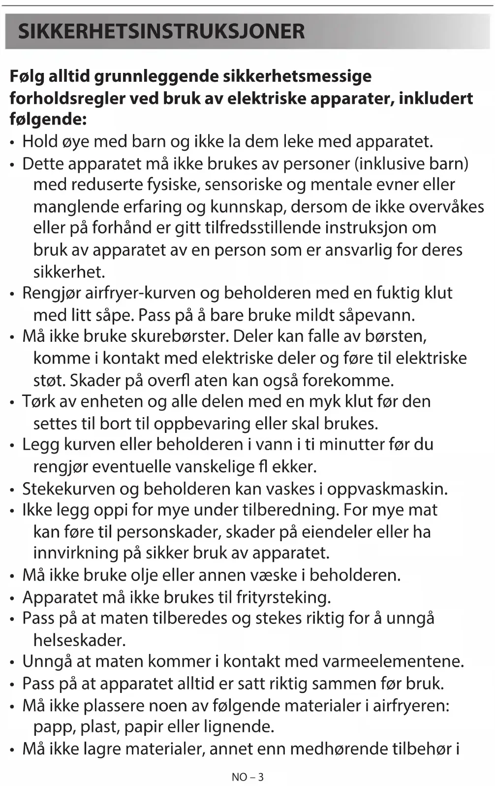 - Må ikke lagre materialer, annet enn medhørende tilbehør i NO – 4 NO – 4 airfryeren når den ikke er i bruk.