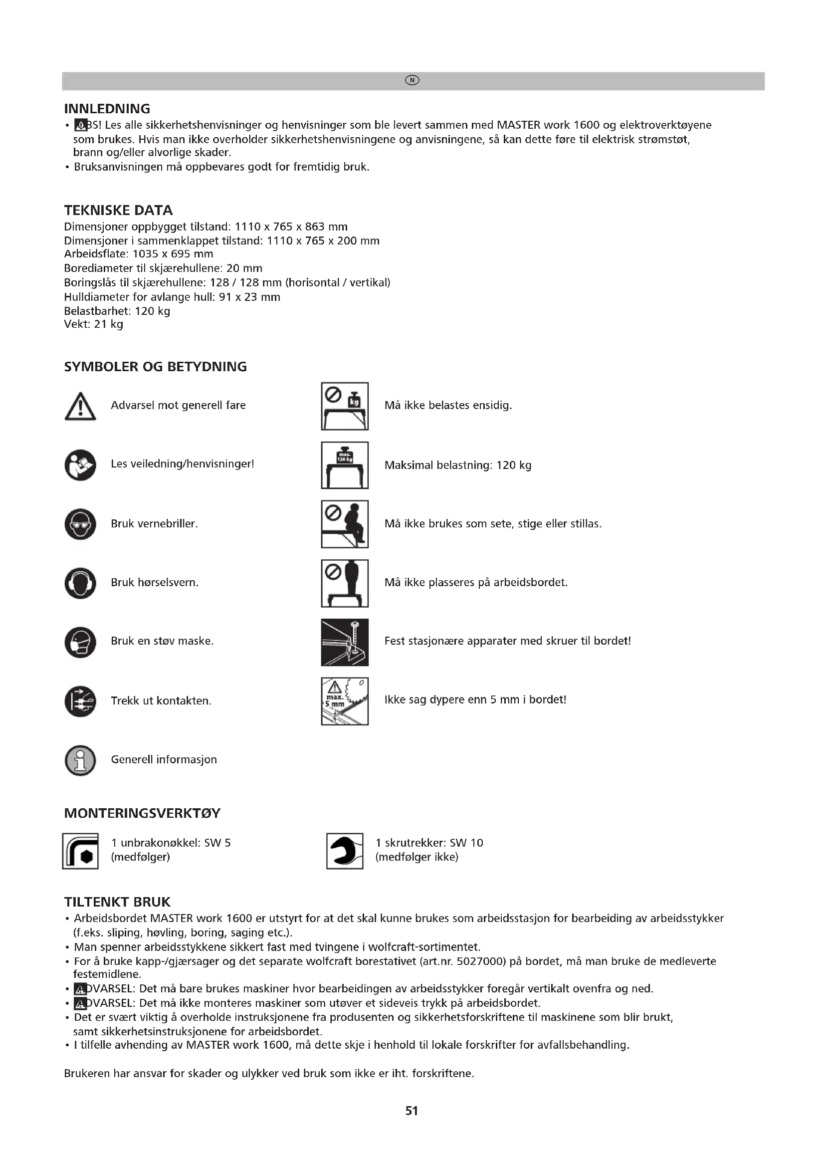 Last ned instruksjonene for din Bord i PDF-format gratis! Finn veiledningen din MASTER work 1600 - WOLFCRAFT og ta den elektroniske enheten tilbake i hendene. På denne siden er alle dokumenter som er nødvendige for bruken av enheten din publisert. MASTER work 1600 av merket WOLFCRAFT.