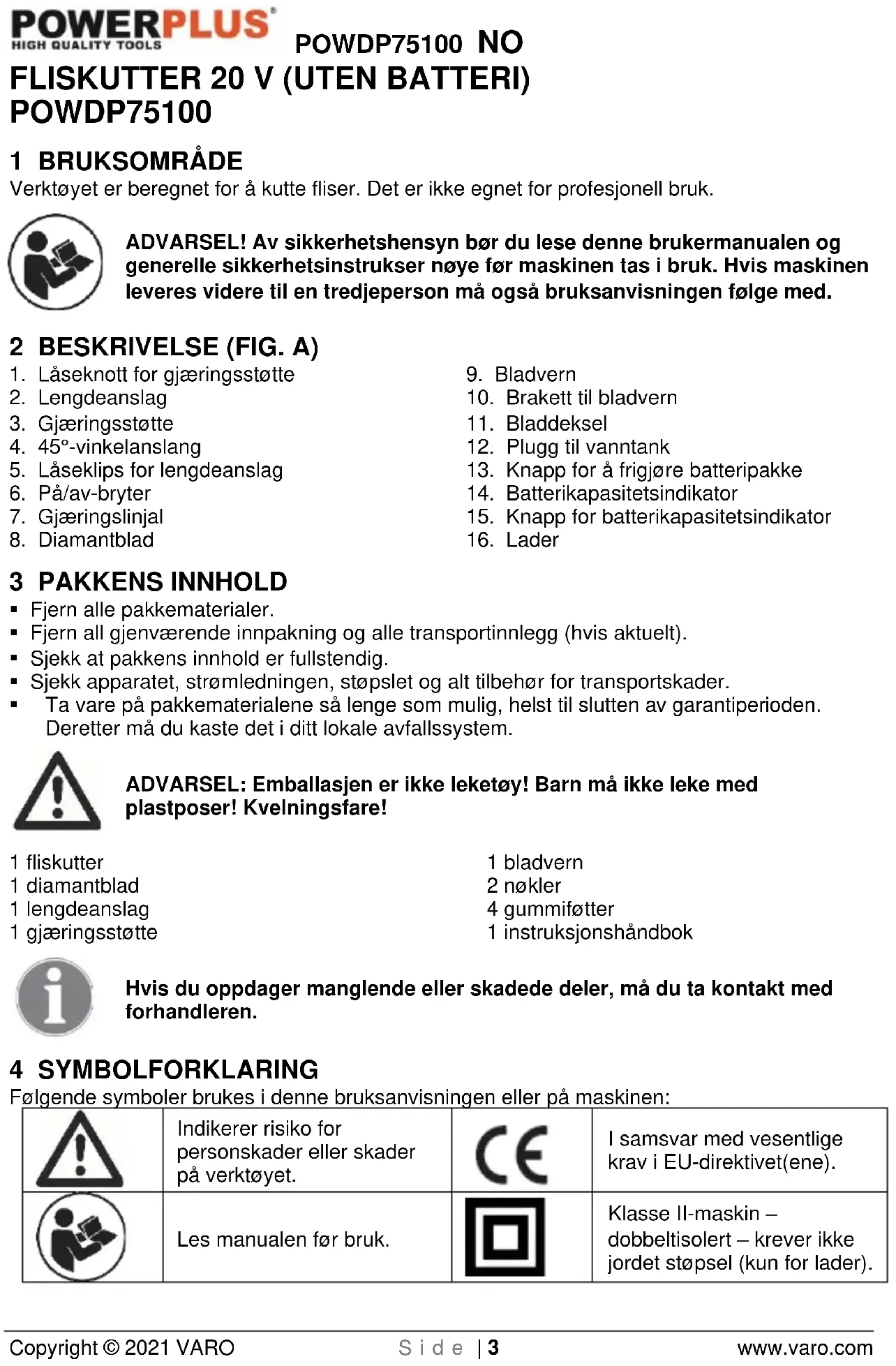 Copyright © 2021 VARO S i d e | 3 www.varo.com FLISKUTTER 20 V (UTEN BATTERI) POWDP75100 1 BRUKSOMRÅDE Verktøyet er beregnet for å kutte fliser. Det er ikke egnet for profesjonell bruk. ADVARSEL! Av sikkerhetshensyn bør du lese denne brukermanualen og generelle sikkerhetsinstrukser nøye før maskinen tas i bruk. Hvis maskinen leveres videre til en tredjeperson må også bruksanvisningen følge med. 2 BESKRIVELSE (FIG. A)