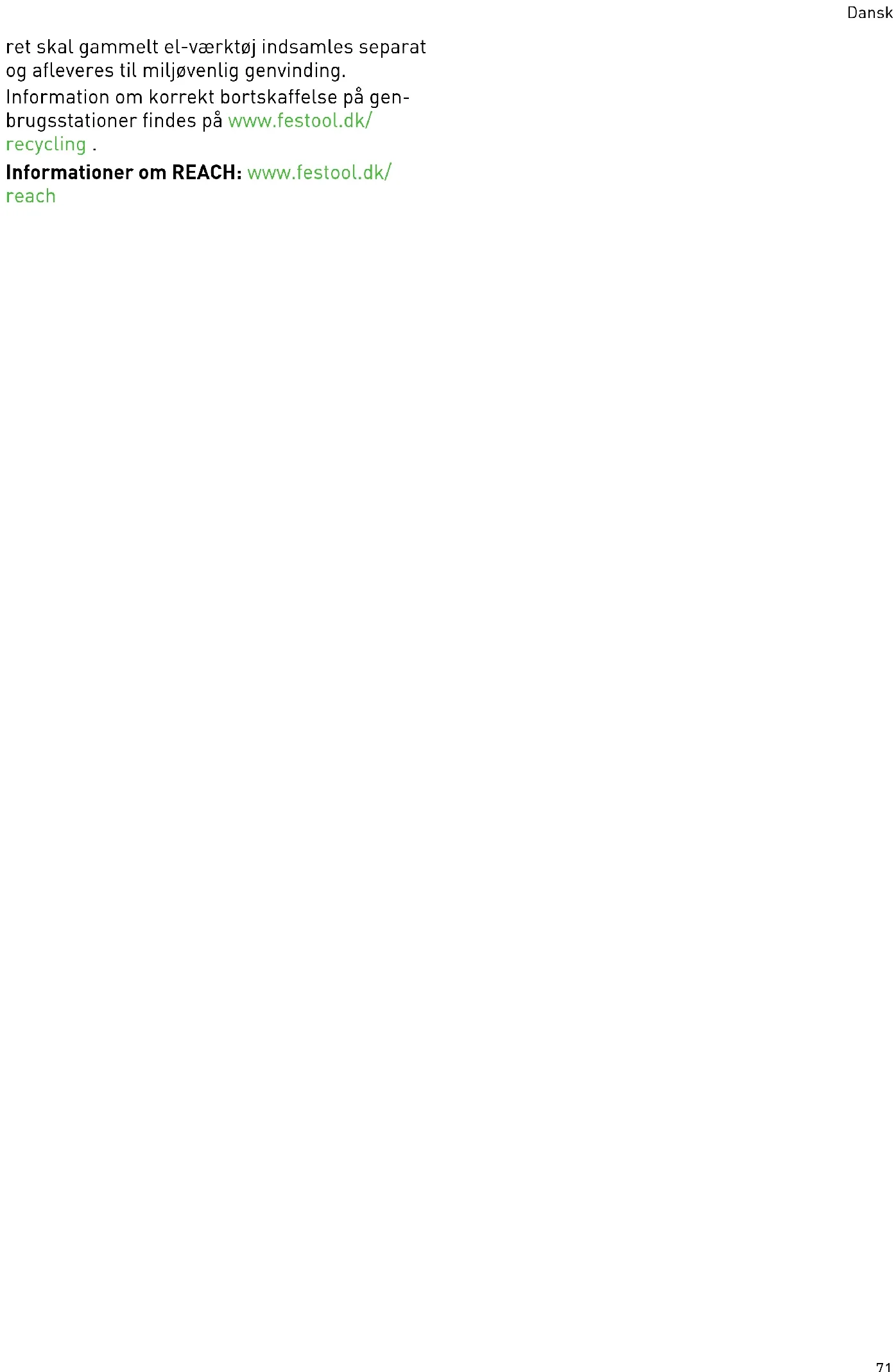 - Maskinen er utstyrt med spesialkull som kob les ut automatisk. Når disse er slitt, blir strøm men avbrutt automatisk og maskinen stanser. Vær obs på følgende: ► Skadede verneinnretninger og deler må re pareres eller byttes fagmessig av et god kjent verksted dersom ikke annet er oppgitt i bruksanvisningen. ► Hold alltid kjøleluftåpningene på huset åpne og rene for å sikre luftsirkulasjonen. 10 Tilbehør Bruk bare originale innsatsverktøyer og tilbe hør fra Festool. Ved bruk av innsatsverktøy av lavere kvalitet og tilbehør fra andre produsen ter kan det oppstå økt fare for personskader og stor ubalanse, noe som kan forringe kvaliteten på resultatet og øke slitasjen på elektroverktøy et. Bestillingsnumrene for tilbehør og verktøy fin ner du på www.festool.com. Norsk 7711 Miljø Apparatet skal ikke kastes i restavfal let! Apparater, tilbehør og emballasje skal leveres til gjenvinning. Ta hensyn til gjeldende nasjonale forskrifter. I henhold til EU-direktivet om kasserte elektri ske og elektroniske produkter og direktivets implementering i nasjonal rett må elektroverk tøy som ikke lenger skal brukes, samles sepa rat og leveres til miljøvennlig gjenvinning. Informasjon om gjenvinningsstasjoner finnes på www.festool.com/recycling . Informasjon om REACH: www.festool.com/ reach Norsk 78Índice 1 Símbolos p. 79