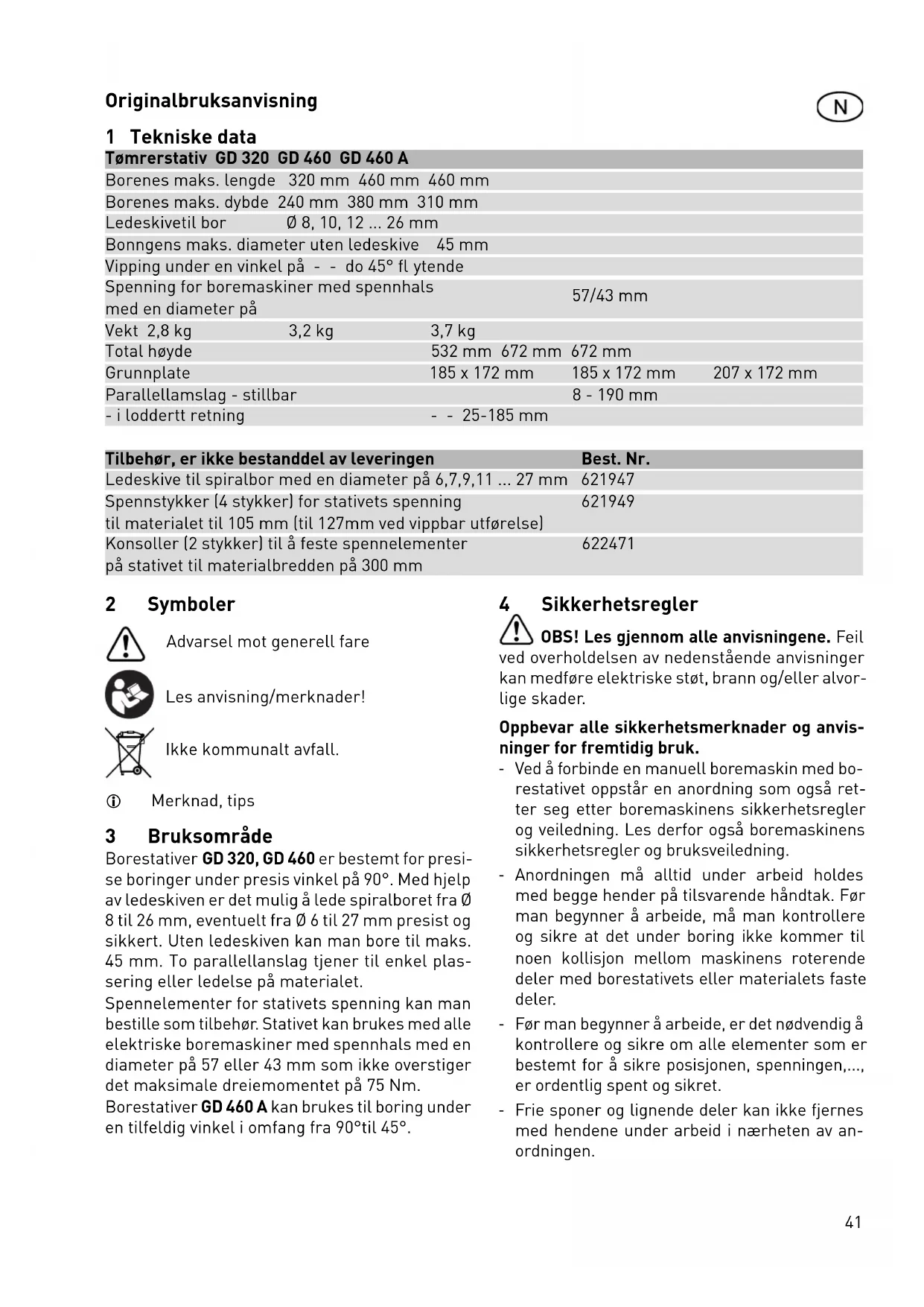 Last ned instruksjonene for din Boremaskin i PDF-format gratis! Finn veiledningen din GD 460 A - FESTOOL og ta den elektroniske enheten tilbake i hendene. På denne siden er alle dokumenter som er nødvendige for bruken av enheten din publisert. GD 460 A av merket FESTOOL.