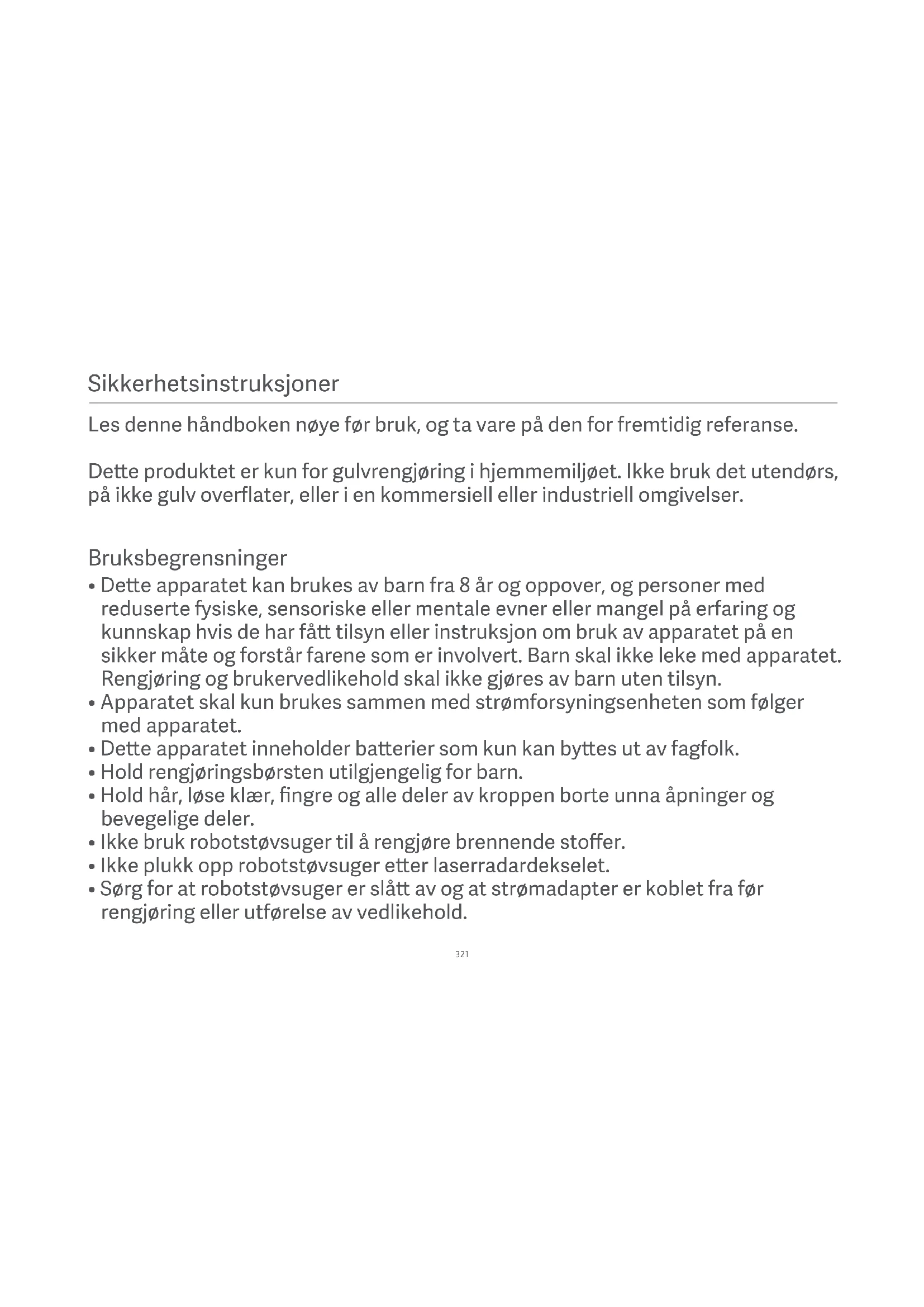 - Litium-ionbaeripakken inneholder stoffer som er farlig for omgivelsene. Før avhending av robotstøvsuger, ern først baeripakken, og kast eller resirkuler den dereer i samsvar med lokale lover og forskrier i landet eller regionen den brukes i. produktsikkerhet for laserprodukter i klasse 1, og produserer ikke laserstråling som er farlig for menneskekroppen.