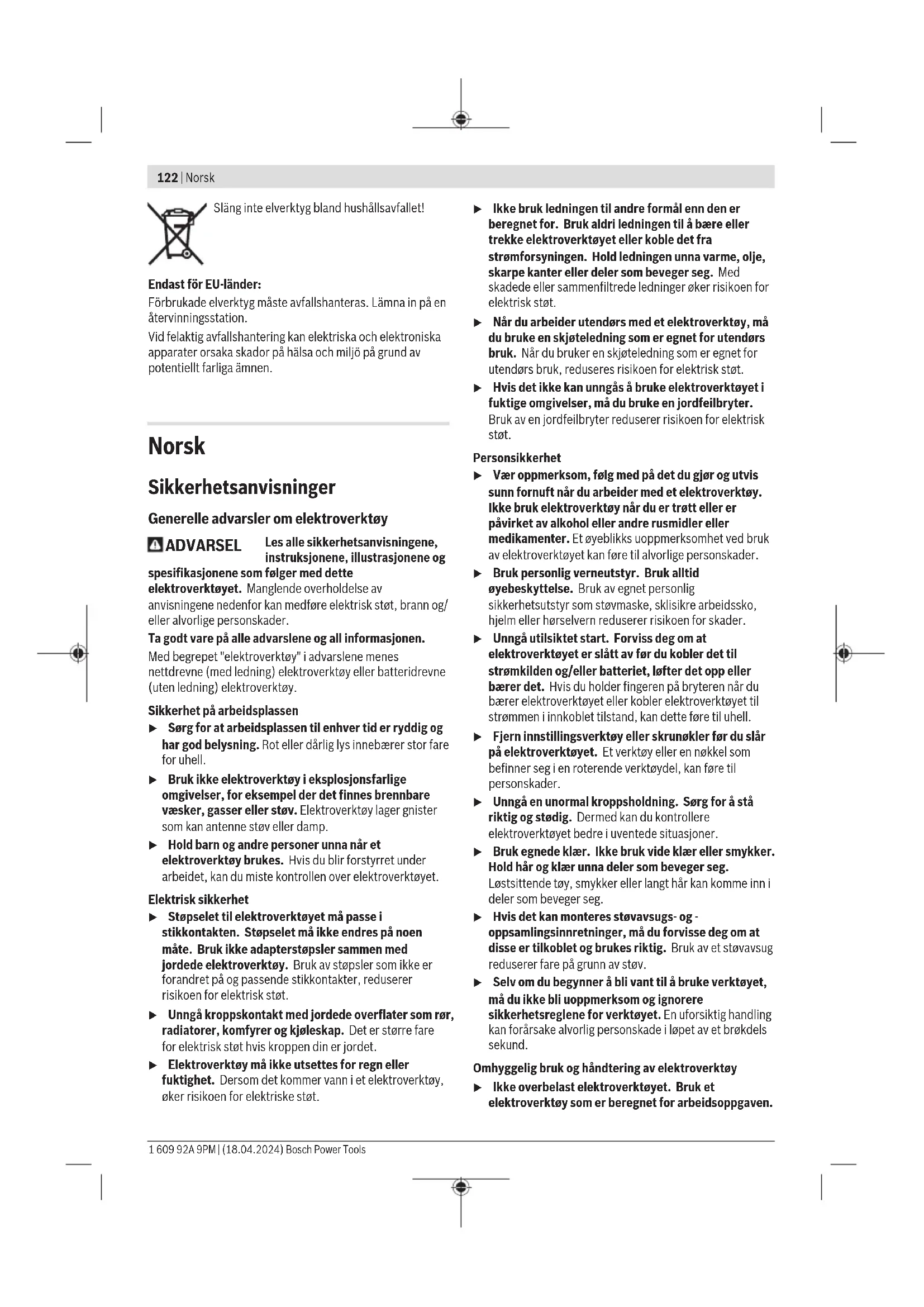 kg 16,8 16,8 Kapslingsgrad /II /II Egnede sagbladmål Sagbladdiameter D mm 216 216 Stambladtykkelse mm 1,2−1,8 1,2−1,8 Hulldiameter d mm 30 25,4 A) Vekt uten strømkabel og uten nettstøpsel Informasjonen gjelder for nominell spenning [U] på 220V. Ved avvikende spenning og på utførelser for bestemte land kan disse angivelsene variere. Tillatte emnemål (maksimums-/minimumsmål): (se „Godkjente arbeidsstykkemål“, Side130) Verdiene kan variere avhengig av produktet, bruksområdet og miljøforholdene. Du finner mer informasjon på www.bosch-professional.com/wac. Informasjon om støy Støyemisjon målt i henhold tilENIEC62841-3-9. Vanlig A-støynivå for elektroverktøyet: lydtrykknivå95dB(A); lydeffektnivå109dB(A). Usikkerhet K=3dB. Bruk hørselvern! Støyutslippsverdien som er angitt i disse anvisningene er målt iht. en standardisert målemetode og kan brukes til sammenligning av elektroverktøy med hverandre. Den egner seg også til en foreløpig estimering av støyutslippet. Den angitte støyutslippsverdien representerer de hovedsakelige bruksområdene til elektroverktøyet. Men hvis elektroverktøyet brukes til andre formål, med andre innsatsverktøy eller utilstrekkelig vedlikehold, kan støyutslippet avvike fra det som er angitt. Dette kan føre til en betydelig økning av støyutslippet for hele arbeidstidsrommet. For en nøyaktig vurdering av støyutslippet skal det også tas hensyn til de tidene maskinen er slått av, eller går, men ikke faktisk er i bruk. Dette kan redusere støyutslippet for hele arbeidstidsrommet betraktelig. Montering u Unngå en uvilkårlig starting av elektroverktøyet. I løpet av monteringen og ved alle arbeider på elektroverktøyet må støpselet ikke være tilkoblet strømtilførselen. Leveranseomfang Se illustrasjonen av leveransen i begynnelsen av bruksanvisningen. Kontroller før første gangs bruk av elektroverktøyet om alle delene som er oppført nedenfor fulgte med: – Kapp- og gjærsag med montert sagblad – Klemhjul (45) – Justerbar anleggsskinne (28) – Skrutvinge (41) – Unbrakonøkkel/sporskrutrekker (43) – Støvpose (37) – Emneunderlag (26) (2stk.) 1 609 92A 9PM | (18.04.2024) Bosch Power ToolsNorsk | 127 Merknad: Undersøk om elektroverktøyet er skadet. Før videre bruk av elektroverktøyet må beskyttelsesinnretninger eller lett skadede deler kontrolleres nøye med hensyn til feilfri og forskriftsmessig funksjon. Kontroller om de bevegelige delene fungerer feilfritt og ikke blokkeres, og at ingen deler er skadet. Samtlige deler må være riktig montert og oppfylle alle betingelser for å sikre en feilfri drift. Skadede beskyttelsesinnretninger og deler må repareres eller skiftes ut på en sakkyndig måte av et godkjent fagverksted. Montering av enkeltdeler – Ta alle medleverte deler forsiktig ut av emballasjen. – Fjern all emballasjen til elektroverktøyet og tilbehøret som ble levert sammen med verktøyet. – For å gjøre det lettere å montere delene som følger med må du kontrollere at elektroverktøyet er i transportstilling. Montere emneunderlag (se bildeA1) Emneunderlagene (26) kan plasseres til venstre, høyre eller foran på elektroverktøyet. Det fleksible festesystemet gir mulighet til mange forskjellige forlengelses- eller utvidelsesvarianter (se bildeG). – Alt etter behov setter du emneunderlaget (26) i festene (47) på elektroverktøyet eller i festene (48) til det andre emneunderlaget. u Bær aldri elektroverktøyet ved å holde i emneunderlagene. Transporter elektroverktøyet bare ved bruk av transportinnretningene. Montere klemhjulet (se bildeA2) Klemhjulet (45) låser den innstilte vertikale gjæringsvinkelen og er nødvendig for sikker drift. – Skru av sekskantmutteren på gjengebolten (49). – Skru klemhjulet (45) med urviseren på gjengebolten (49), og stram det. Montere den justerbare anleggsskinnen (se bildeA3) Den justerbare anleggsskinnen (28) må monteres før saging. – Skyv anleggsskinnen (28) i det tilsvarende sporet til høyre for sagbladet, og stram låseskruen (44). Den flate delen på anleggsskinnen må vende inn mot sagbladet. Stasjonær eller fleksibel montering u Til en sikker bruk må du montere elektroverktøyet før bruk på et jevn og stabil arbeidsflate (f.eks. arbeidsbenk). Montering på en arbeidsflate (se bilde B1−B2) – Fest elektroverktøyet på arbeidsflaten med en egnet skruforbindelse. Bruk hullene (15). eller – Spenn fast føttene til elektroverktøyet på arbeidsflaten med vanlige skrutvinger. Montering på et Bosch-arbeidsbord GTA-arbeidsbordene fra Bosch har høydejusterbare ben, slik at elektroverktøyet holdes sikkert på plass uansett underlag. Arbeidsbordenes emneholdere fungerer som støtte for lange emner. u Les gjennom alle advarsler og instrukser som fulgte med arbeidsbenken. Feil ved overholdelsen av advarslene og instruksene kan medføre elektriske støt, brann og/eller alvorlige skader. u Sett arbeidsbenken korrekt opp før du monterer elektroverktøyet. En feilfri oppbygging er viktig for å forhindre at benken bryter sammen. – Monter elektroverktøyet i transportstilling på arbeidsbenken. Fleksibel oppstilling (anbefales ikke!) (se bilde B3) Hvis det i unntakstilfeller ikke er mulig å montere elektroverktøyet på en plan og stabil arbeidsflate, kan du plassere det med veltebeskyttelse som hjelp. u Uten veltebeskyttelsen står ikke elektroverktøyet stabilt, og det kan velte, spesielt ved saging av maksimale horisontale og/eller vertikale gjæringsvinkler. – Drei veltebeskyttelsen (20) bakover eller utover til elektroverktøyet står rett på arbeidsflaten. Støv-/sponavsuging Støv fra materialer som blyholdig maling, noen tresorter, mineraler og metall kan være helsefarlige. Berøring eller innånding av støv kan utløse allergiske reaksjoner og/eller åndedrettssykdommer hos brukeren eller personer som befinner seg i nærheten. Visse typer støv som eike- eller bøkestøv gjelder som kreftfremkallende, spesielt i komb