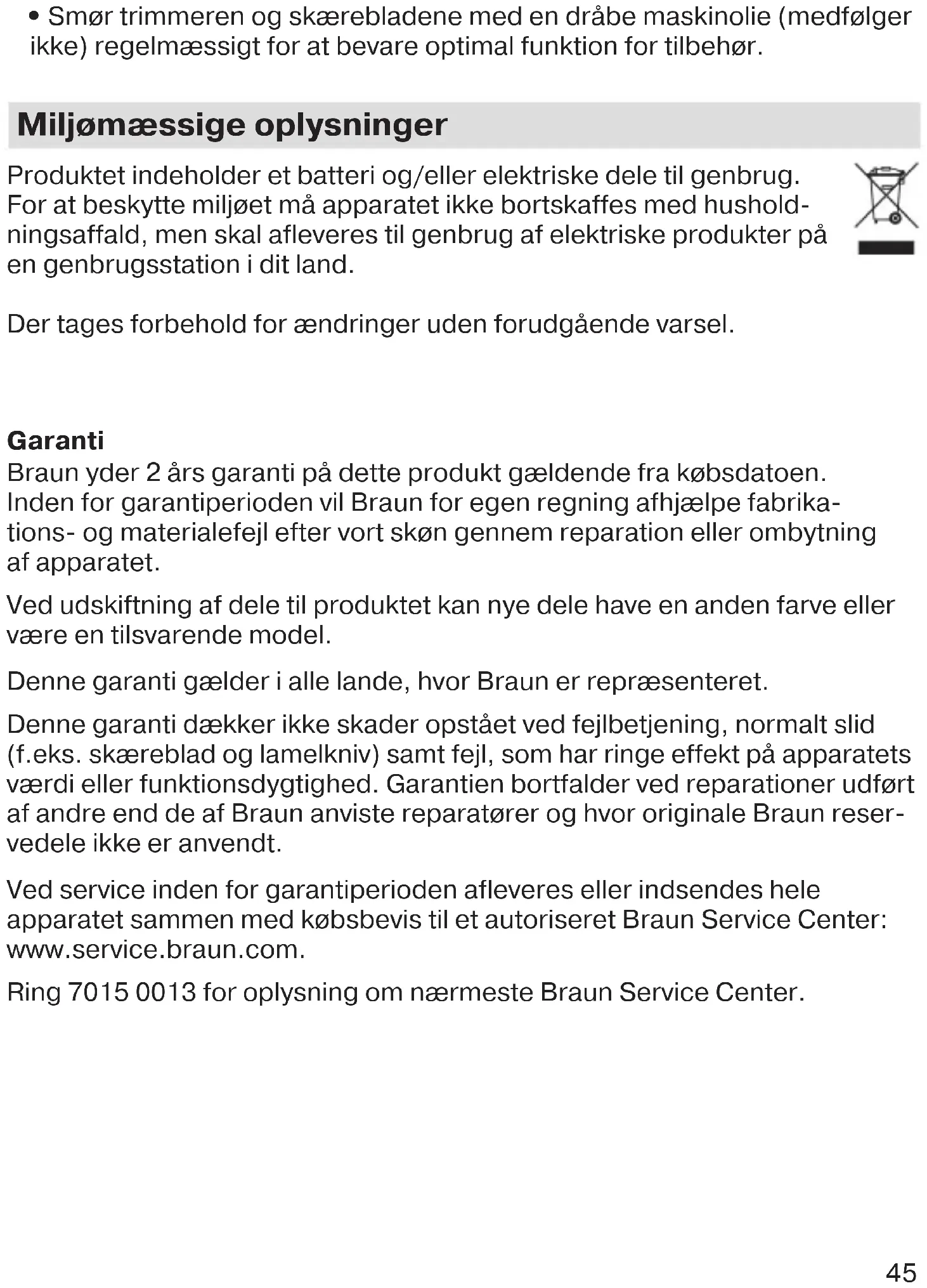 , kan du bruke det med alle strømledninger fra Braun merket 492-XXXX. Bruk aldri apparatet hvis trimmerne, kammene, spesialled- ningssettet eller annet tilbehør er skadet. Apparatet må ikke åpnes! Dette apparatet kan brukes av barn fra 8 år og oppover og av personer med reduserte fysiske, sensoriske eller men- tale evner, eller manglende erfaring og kunnskap hvis de er under tilsyn og har fått instruksjon om sikker bruk og forstår farene som er involvert. Hvis apparatet leveres med et hårklippingstilbehør, kandet brukes for hårklipping av barn over 3 år under tilsyn. Barn skal ikke leke med apparatet. Rengjøring og bruks- vedlikehold av apparatet skal ikke foretas av barn. 90012280_Type5542_BT_7350_7340_7330_7320_5365_5360_5342_5340_MN_ANZ.indd 4690012280_Type5542_BT_7350_7340_7330_7320_5365_5360_5342_5340_MN_ANZ.indd 46 13.09.21 09:1913.09.21 09:1947 Beskrivelse 1a Presisjonsskjeggkam (1–10 mm) 1b Presisjonshårkam (11–20 mm)* 1c Sensitiv kam* 1d Fast kam 1 (1 mm)* 2a Trimmerhode** 2b Detaljtrimmerhode* 2c Barberhode med mini-skjæreblad* 3 Lengdeinnstilling 4 På/av-knapp 5 Ladeindikator 6 Kontakt 7 Spesialledning** 8 Ladestasjon*