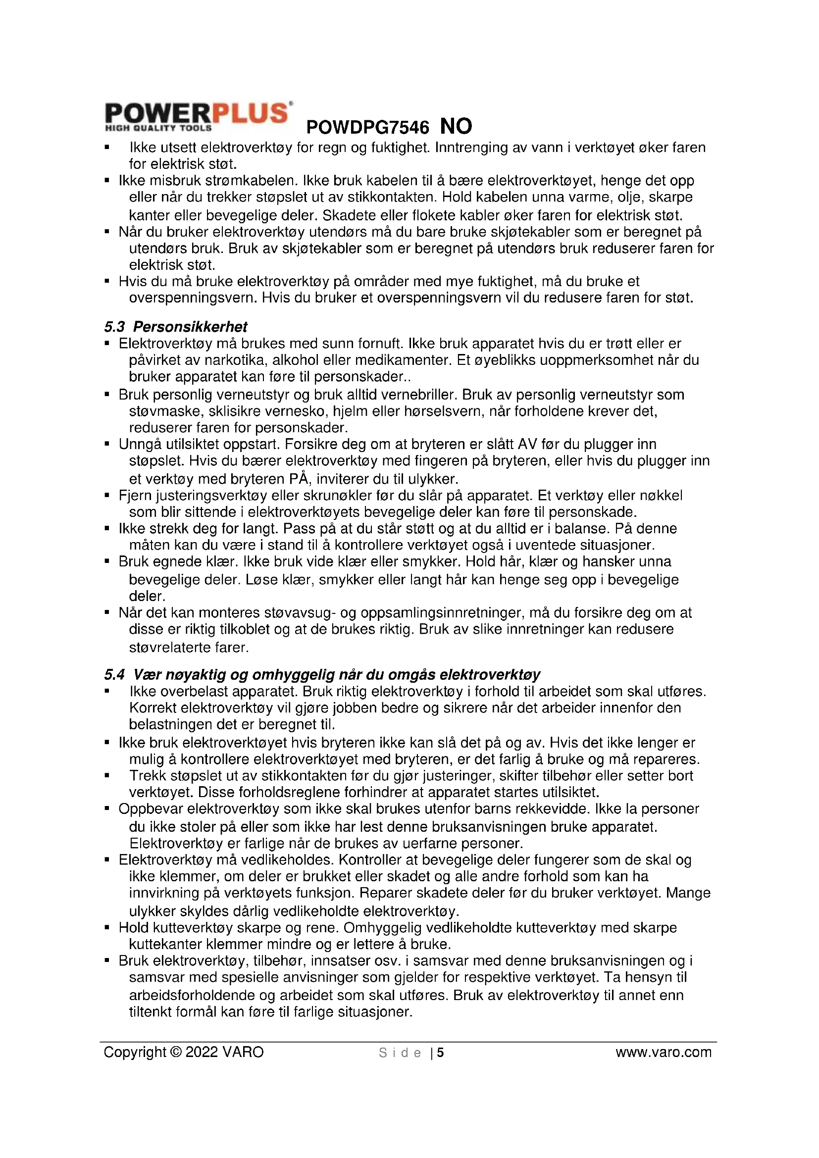 - Bruk elektroverktøy, tilbehør, innsatser osv. i samsvar med denne bruksanvisningen og i samsvar med spesielle anvisninger som gjelder for respektive verktøyet. Ta hensyn til arbeidsforholdende og arbeidet som skal utføres. Bruk av elektroverktøy til annet enn tiltenkt formål kan føre til farlige situasjoner.POWDPG7546 NO Copyright © 2022 VARO S i d e | 6 www.varo.com