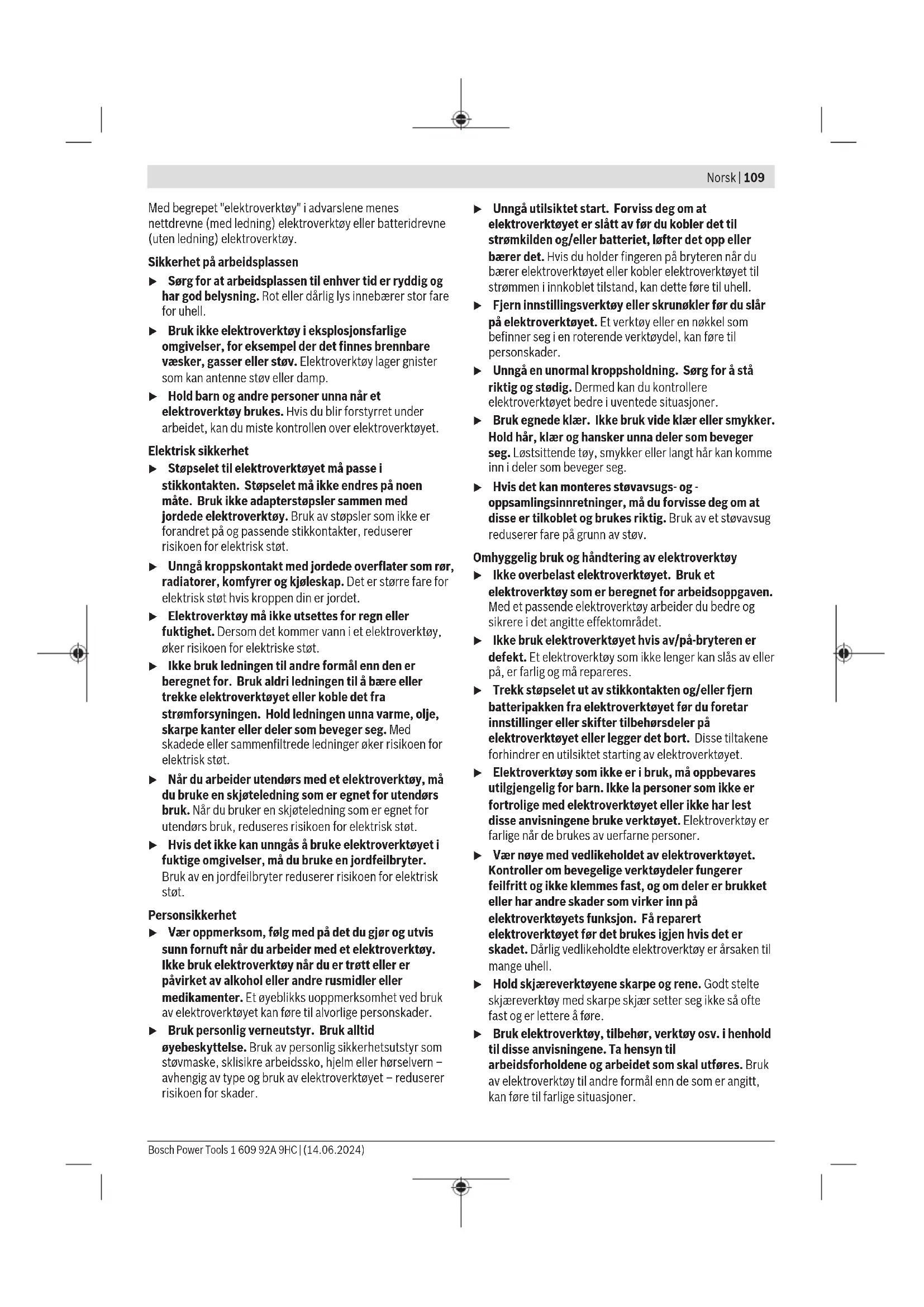 – Minstetykkelse på betongelementet h – Minsteavstand mellom to spikre s min – Minste kantavstand c min – Anbefalt last Montere festeelementer (GNB18V‑40) (sebildeE−F) Du kan montere festeelementer av plast eller stål enkeltvis på underlaget med elektroverktøyet. Eksempler på festeelementer: Bestillingsnummer Beskrivelse 1 600 A03 2G6 Rørklemme 16mm 1 600 A03 2G7 Rørklemme 20mm 1 600 A03 2G8 Rørklemme 25mm 1 600 A03 2G9 Rørklemme 32mm 1 600 A03 2GA Rørklemme 40mm 1 600 A03 2GB Kabelbøyle (én side) for 8kabler 1 600 A03 2GC Kabelbøyle (to sider) for 16kabler 1 600 A03 2GD Kabelholder for 20kabler 1 600 A03 2GE Kabelholder for 40kabler 1 600 A03 2GF Buntebåndanker 1 600 A03 2GG Buntebånd 8−32mm 1 600 A03 2GH Buntebånd 16−63mm Du finner hele sortimentet av festeelementer fra Bosch på www.bosch-pt.com. u Bruk utelukkende festeelementer som anbefales for ditt elektroverktøy av Bosch. Bruk av festeelementer som ikke er tillatt for elektroverktøyet kan skade verktøyet og forårsake personskader. For festeelementer av plast bruker du det smale kontaktelementet(23) (se bildeE). For festeelementer av stål bruker du standardkontaktelementet(17) (se bildeF). Skyv magnetringen(24) sideveis over spissen på kontaktelementet til den låses på plass. Sett festeelementet med den beregnede spikeråpningen, på kontaktelementet(23) eller magnetringen(24). u Du må alltid sette på bare ett enkelt festeelement. Flere elementer over hverandre kan føre til personskader eller materielle skader. u Hold alltid hendene ved siden av munningen når du setter på festeelementet. Rett alltid munningen bort fra deg eller andre personer.Ikke trykk kontaktelementet innover. Hold fingrene i avstand fra utløseren. Ved en uventet utløsing kan en spiker skytes ut, noe som kan føre til personskader eller skader på elektroverktøyet. Trykk kontaktelementet med påsatt festeelement på underlaget. Utløs inndrivingen på vanlig måte. Stille inn dybdeanlegget Still inn inndrivingsdybden med bryteren for dybdeanlegg(20), slik at den riktige verdien for avstanden til spikerhodet h NHS nås. Spikerhode for dypt: Trykk bryteren for dybdeanlegg(20) mot høyre. Hvis spikrene fortsatt drives for dypt inn, bruker du lengre spikre. Spiker ikke langt nok inn: Trykk brytere for dybdeanlegg(20) mot venstre. Hvis spikrene fortsatt ikke drives langt nok inn, bruker du kortere spikre. Fjerne blokkering/tilbakestille Fjern blokkering hvis statusindikatoren(2) lyser rødt eller oransje, eller hvis spikrene ikke lenger drives inn riktig. – Ta ut batteriet(10). Tøm magasinet(12), og ta det av. Ta av kontaktelementet(17). – Kontroller magasinet(12), og fjern smuss, rester og fremmedlegemer. – Kontroller kontaktelementet(17), og fjern spikre, spikersplinter, rester eller fremmedlegemer med doren(21). Pass på at du ikke skader kontaktelementet. – Sett inn kontaktelementet(17), magasinet(12) og batteriet(10) igjen i denne rekkefølgen. – Trykk på knappen(15) på magasinskyveren(14), og skyv den mot magasinåpningen til den låses. – Slå på elektroverktøyet. – Trykk på nullstillingsknappen (4) i 5sekunder til statusindikatoren(2) begynner å blinke. 1 609 92A 9HC | (14.06.2024) Bosch Power ToolsNorsk | 117 – Trykk kontaktelementet (17) mot en trekloss eller lignende, og trykk på utløseren (6). På den måten kan motoren sette slagstempelet i riktig posisjon. – Hvis enda en feil har blitt fastslått, skifter ikke elektroverktøyet til normal drift igjen. Den andre feilen vises i statusindikatoren(2). Demontere fot Foten(13) gjør det lettere å stille elektroverktøyet loddrett på et jevnt underlag. For arbeid på ujevnt underlag kan du demontere foten(13). Dette gjør du ved å skyve den fra magasinet(12) bakover. Henge opp elektroverktøyet Med opphengskroken(25) kan du feste elektroverktøyet som er slått av, på en egnet opphengsanordning. Skru opphengskroken(25) på huset til elektroverktøyet (se bildeG) med skruen som følger med. – Kontroller opphengskroken(25) for skader og deformering. Du må ikke bruke opphengskroken(25) hvis den er skadet, deformert eller ikke lenger sitter fast på elektroverktøyet. – Heng elektroverktøyet på en stabil opphengsanordning ved bruk av opphengskroken(25). For å unngå personskader og materielle skader må ikke opphengsanordningen plasseres over gangveier eller umiddelbare arbeidsområder. Opphengskroken er utelukkende beregnet brukt til oppheng av elektroverktøyet og montert tilbehør. u Bruk aldri opphengskroken som fallsikring. Transport Slå av elektroverktøyet når det skal transporteres, spesielt hvis du bruker stige eller beveger deg i en uvant stilling. Lås utløseren med opplåsingsbryteren(5). Hold bare i håndtaket(7) på elektroverktøyet når du bærer det, og ikke transporter det med aktivert utløser(6). Brukergrensesnitt Brukergrensesnittet: – for å slå elektroverktøyet på/av – for visning av statusen til elektroverktøyet – for visning av batteriets ladenivå – for tilbakestilling Statusindikatorer Farge på status- indikator(2) Betydning/årsak Løsning Grønn Elektroverktøyet er klart til bruk. – Gul Overopphetingsbeskyttelse: Motoren eller elektronikken er for varm. Avkjøl elektroverktøyet. Når motoren og elektronikken har driftstemperatur, skifter elektroverktøyet automatisk til normal drift. Blå Kuldebeskyttelse: Elektroverktøyet er for kaldt. La elektroverktøyet akklimatiseres i varme omgivelser. Når motoren og elektronikken har driftstemperatur, skifter elektroverktøyet automatisk til normal drift. Rød Blokkering registrert: Slagstempelet kan ikke gå tilbake til riktig posisjon. Fjern blokkeringen (se „Fjerne blokkering/tilbakestille“, Side116). Oransje Motoren er blokkert: Slagstempelet kan ikke settes i riktig posisjon. Fjern blokkeringen (se „Fjerne blokkering/tilbakestille“, Side116). Cyan Overstrømsbeskyttelse: Motoren forbruker for mye strøm. Kontroller elektrover