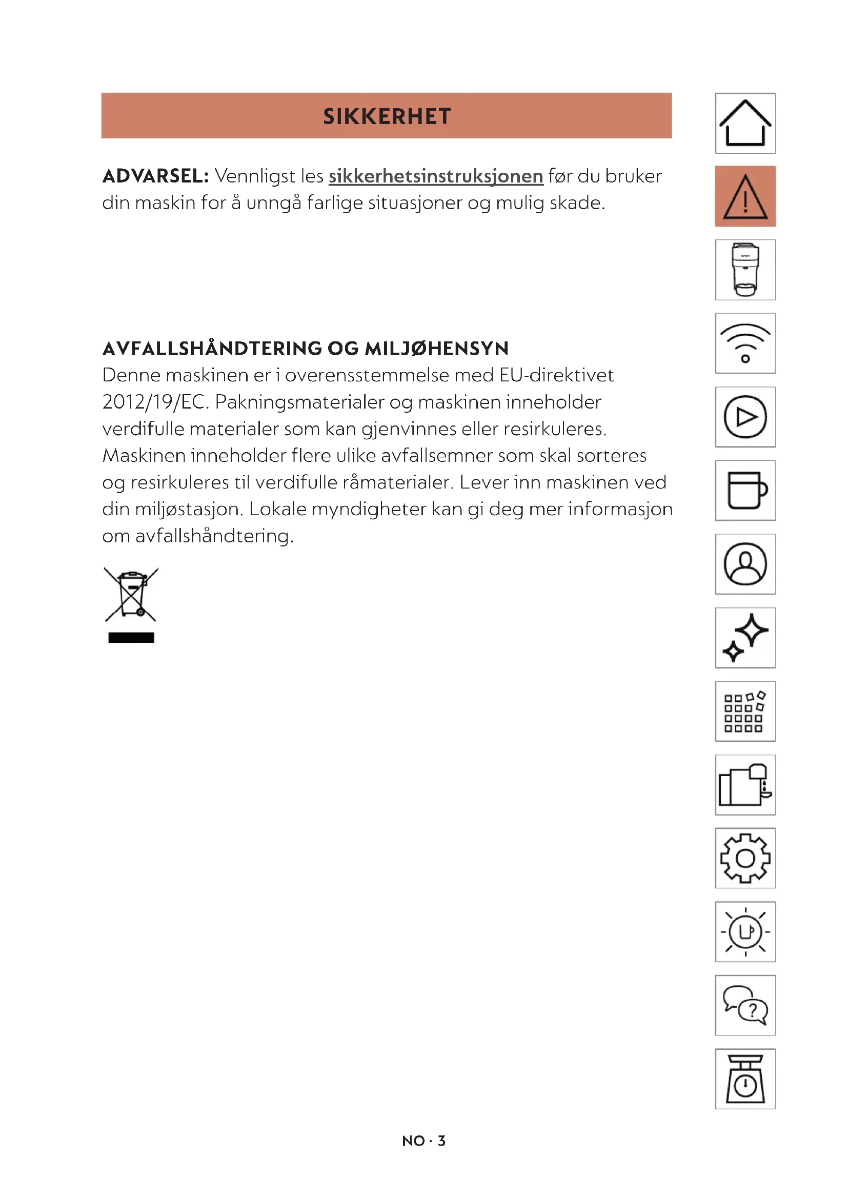 Denne maskinen er i overensstemmelse med EU-direktivet 2012/19/EC. Pakningsmaterialer og maskinen inneholder verdifulle materialer som kan gjenvinnes eller resirkuleres. Maskinen inneholder flere ulike avfallsemner som skal sorteres og resirkuleres til verdifulle råmaterialer. Lever inn maskinen ved din miljøstasjon. Lokale myndigheter kan gi deg mer informasjon om avfallshåndtering.NO